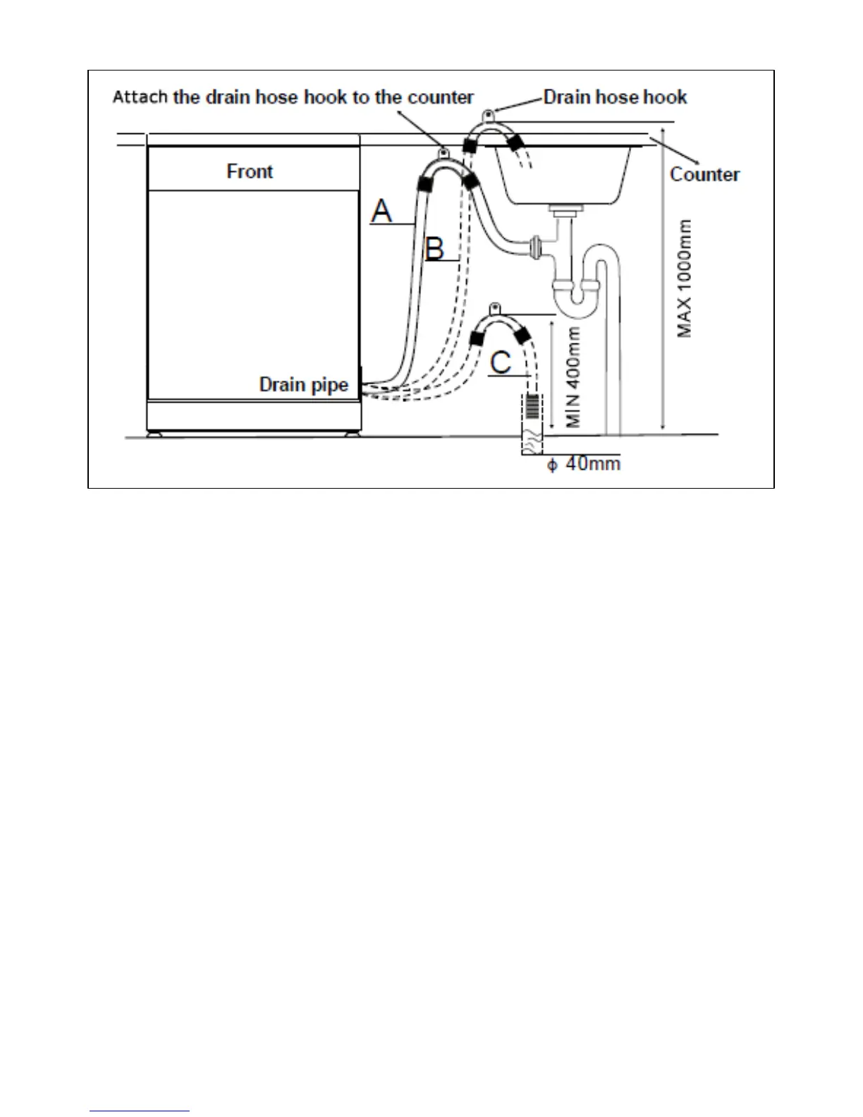 o Secure the drain hose to the wall as indicated in the drawing