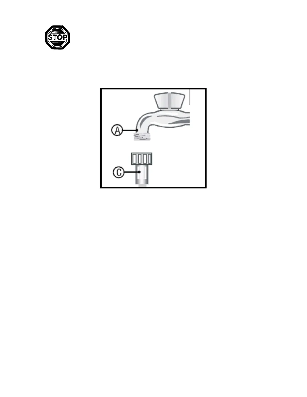 o Connect the water inlet hose (C) to a threaded water tap (A) that