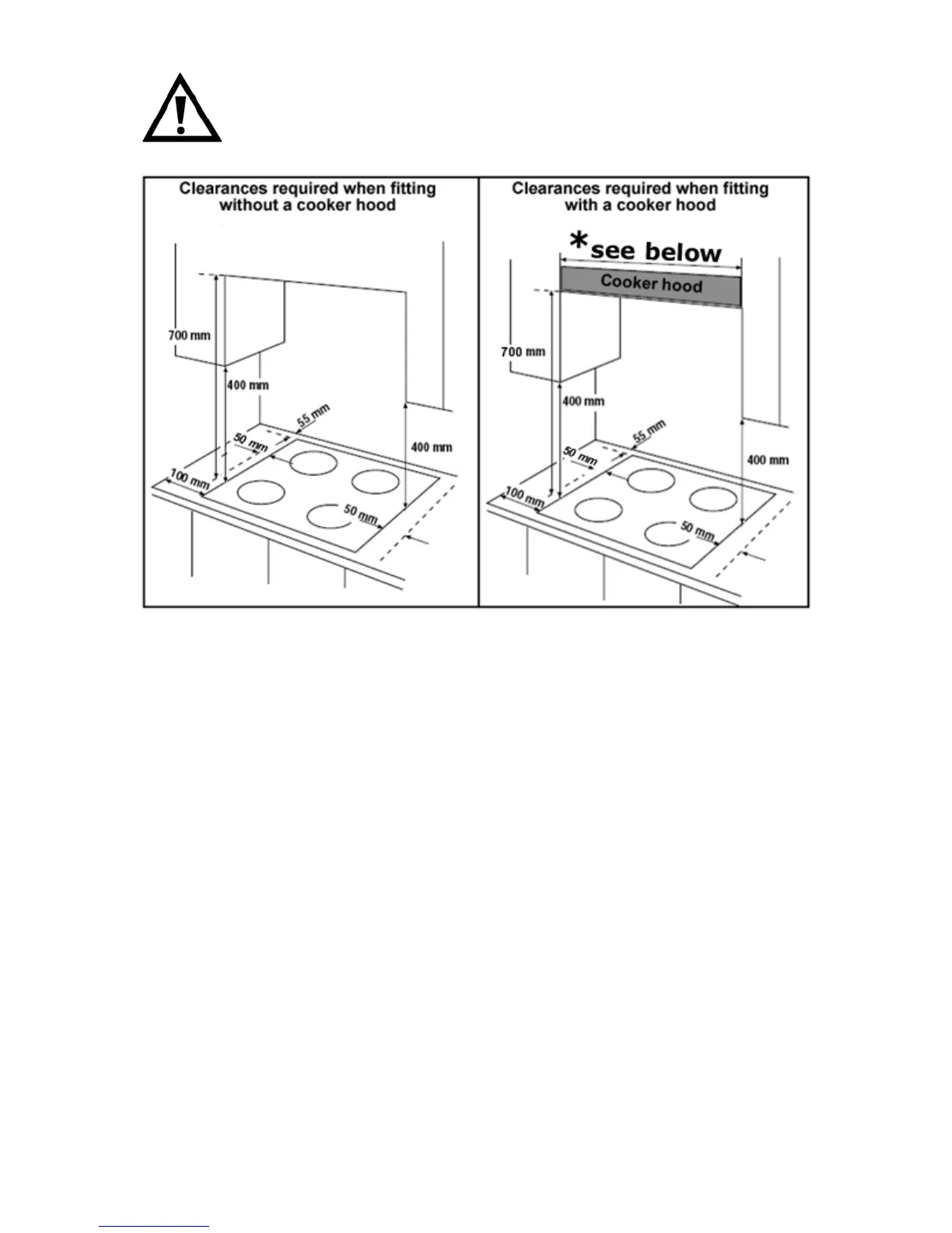 o The edges of the hob must be a minimum distance of 55 mm from