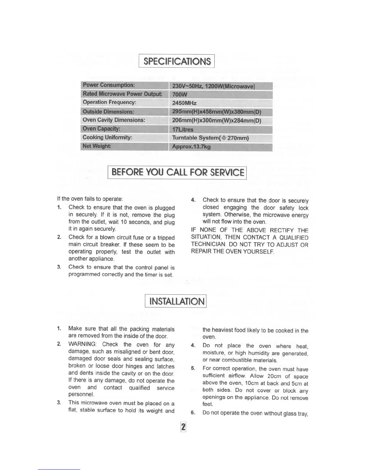 Baumatic BTM17SS - Specifications and Service; Specifications; Before You Call for Service; Installation