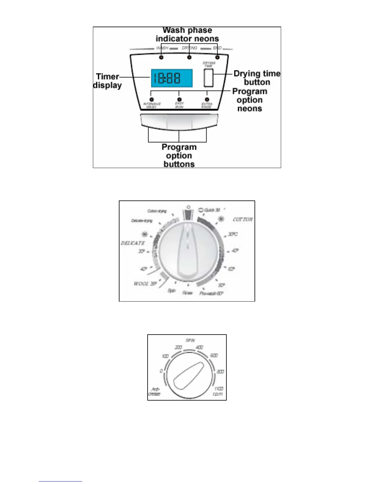 Baumatic BWD1100W - LCD Display; Wash Program Selection Knob; Spin Speed Selection Knob