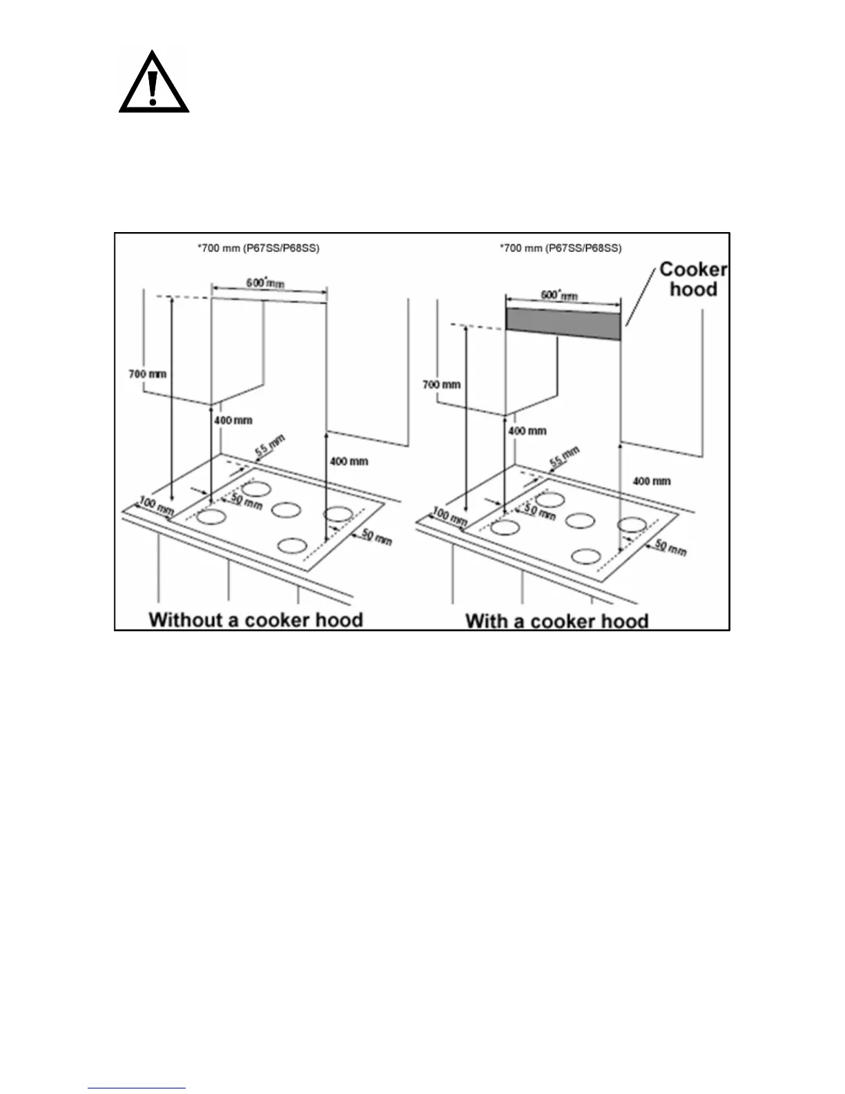 o 700 mm between the hob surface and the underside of any