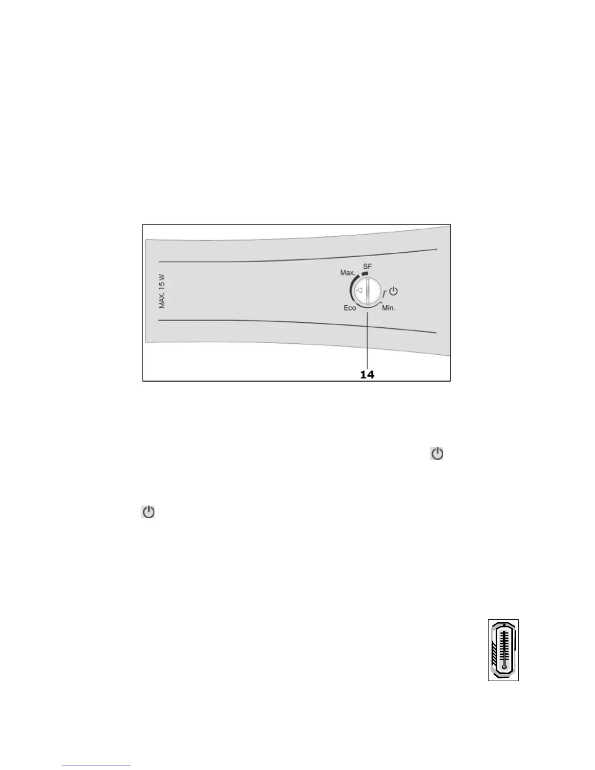 o The appliance is switched on by turning the thermostat dial (14) towards the Max. position. You may need to