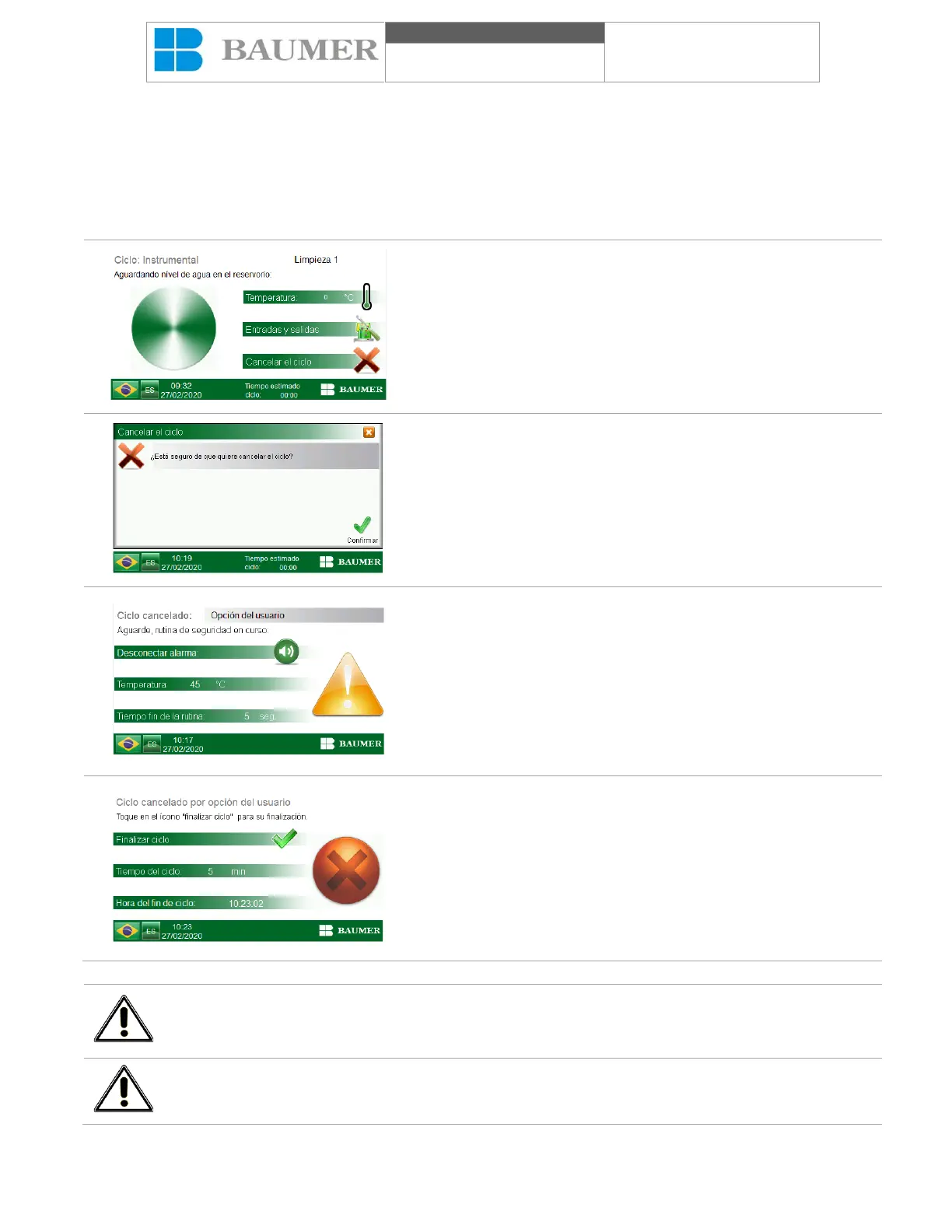 los límites aceptables o la falla del hardware del equipo pueden conducir a la cancelación del ciclo. El usuario también