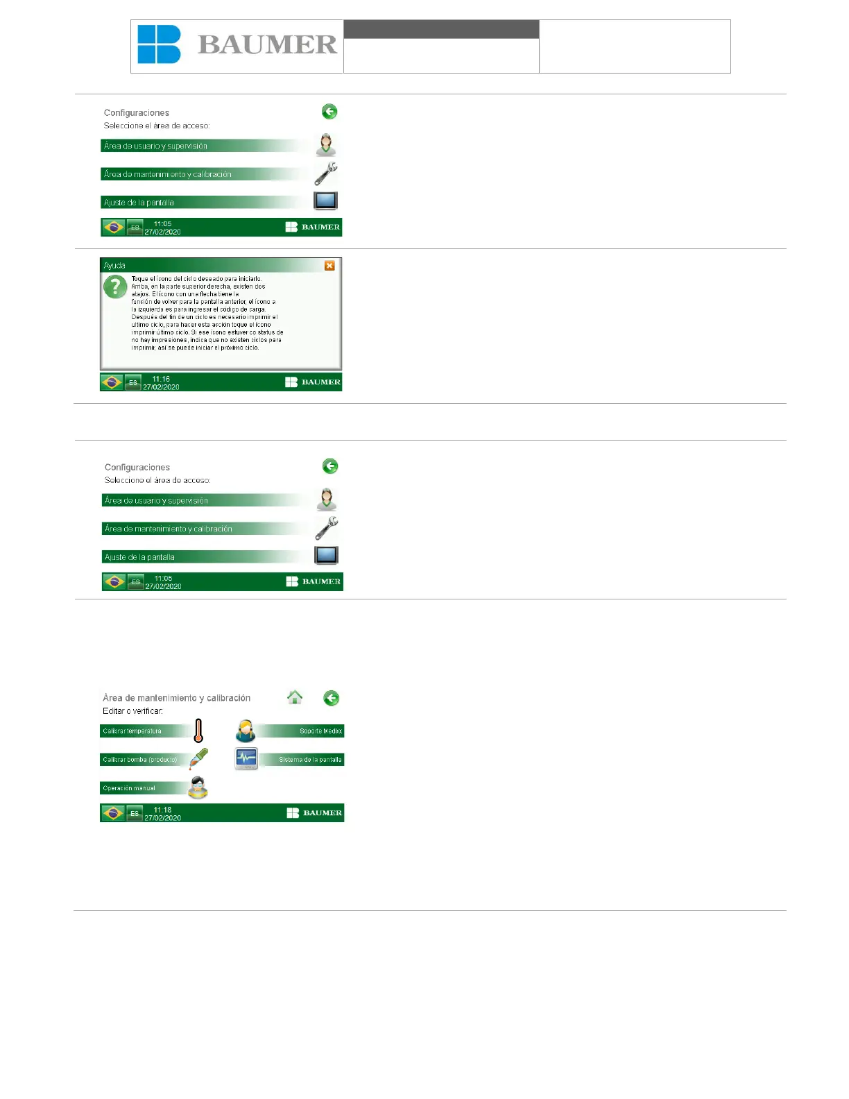 El "Área de calibración y mantenimiento" presenta un menú con