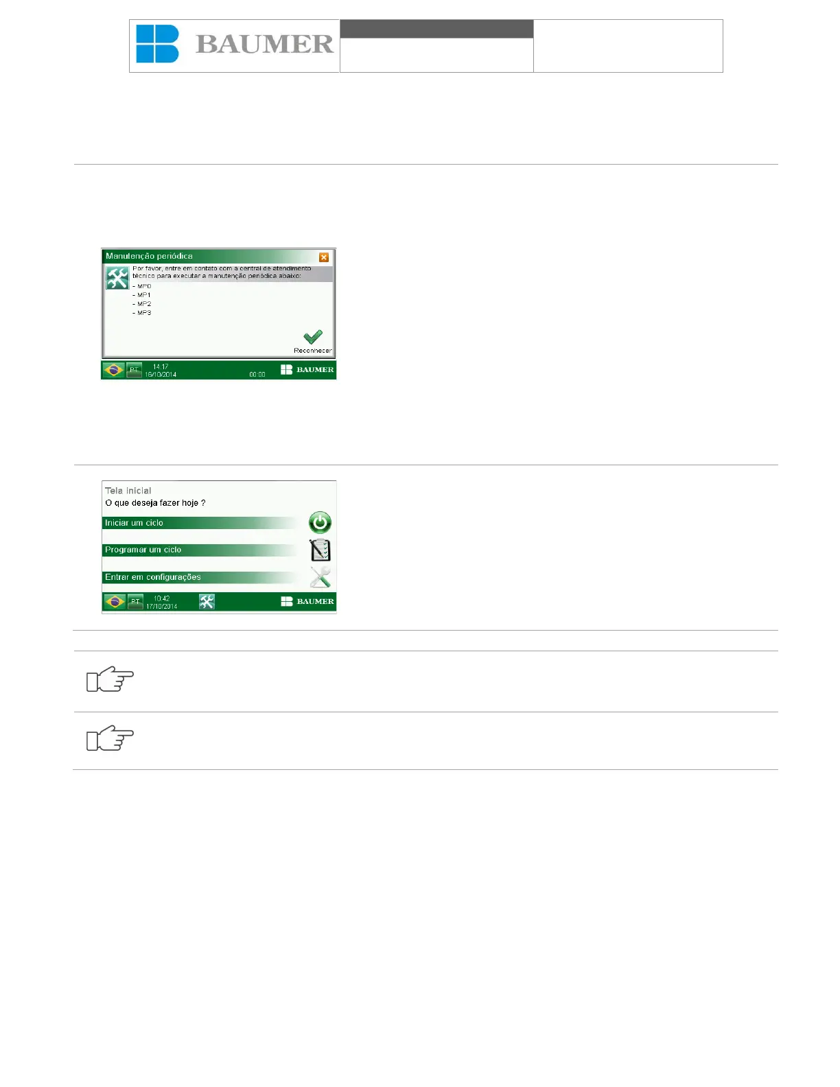 Ao ligar o equipamento se houver alguma manutenção periódica pendente será exibido na tela inicial.