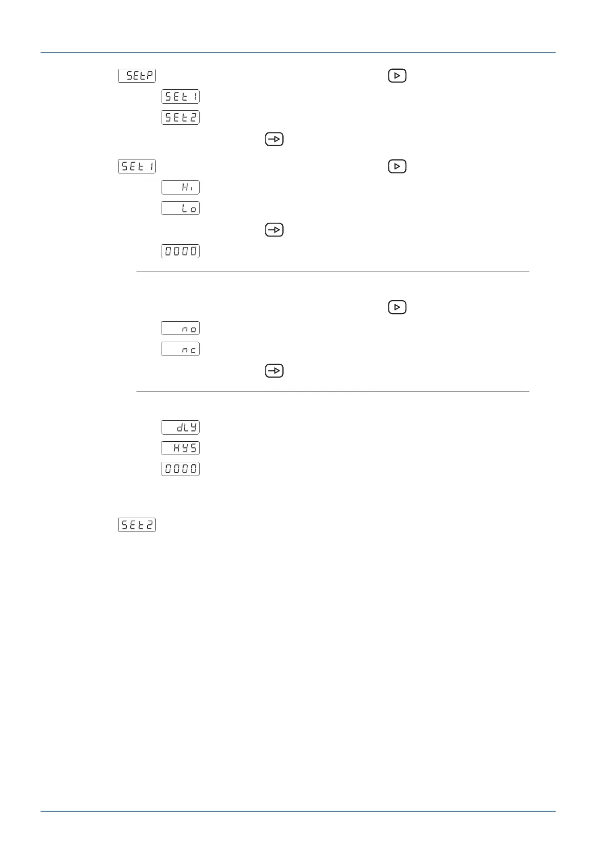 Programming the delay (dLY) from 0 to 99 s or hysteresis (HYS) from 0 to