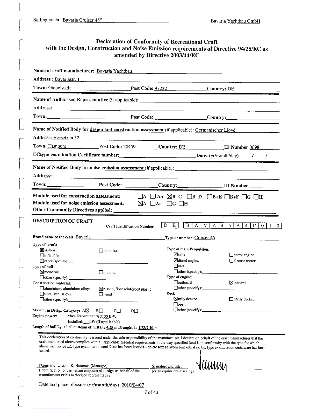 Bavaria Cruiser 45 - Declaration of Conformity; Description of Craft