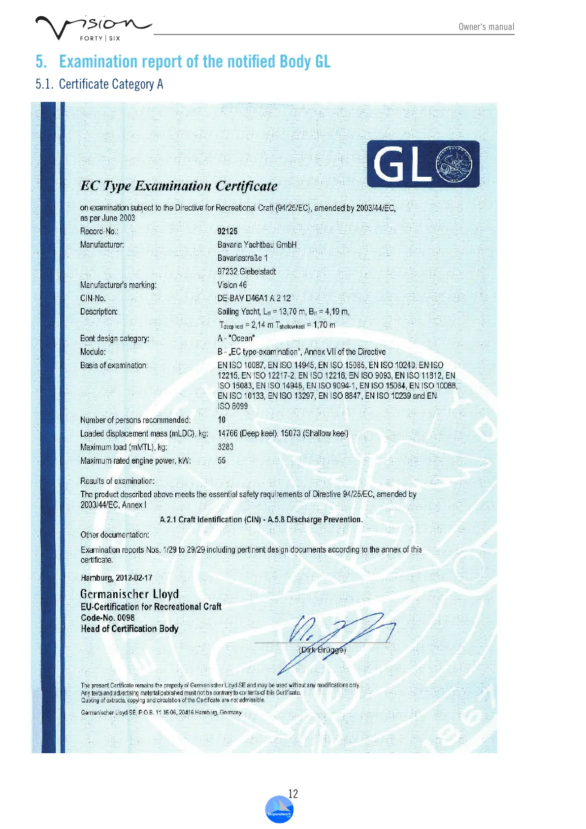 Bavaria Vision 46 - Examination Report of Notified Body GL; Certificate Category A Details
