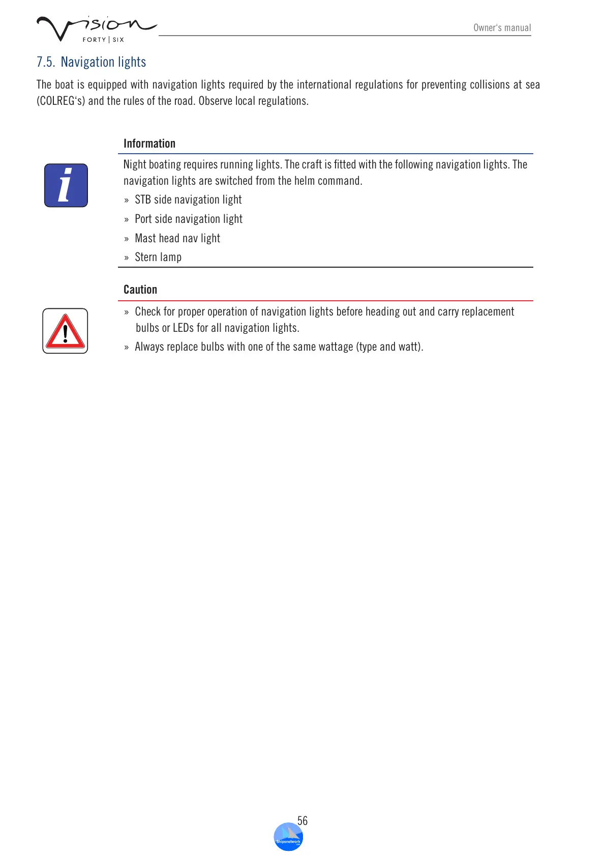 The boat is equipped with navigation lights required by the international regulations for preventing collisions at sea
