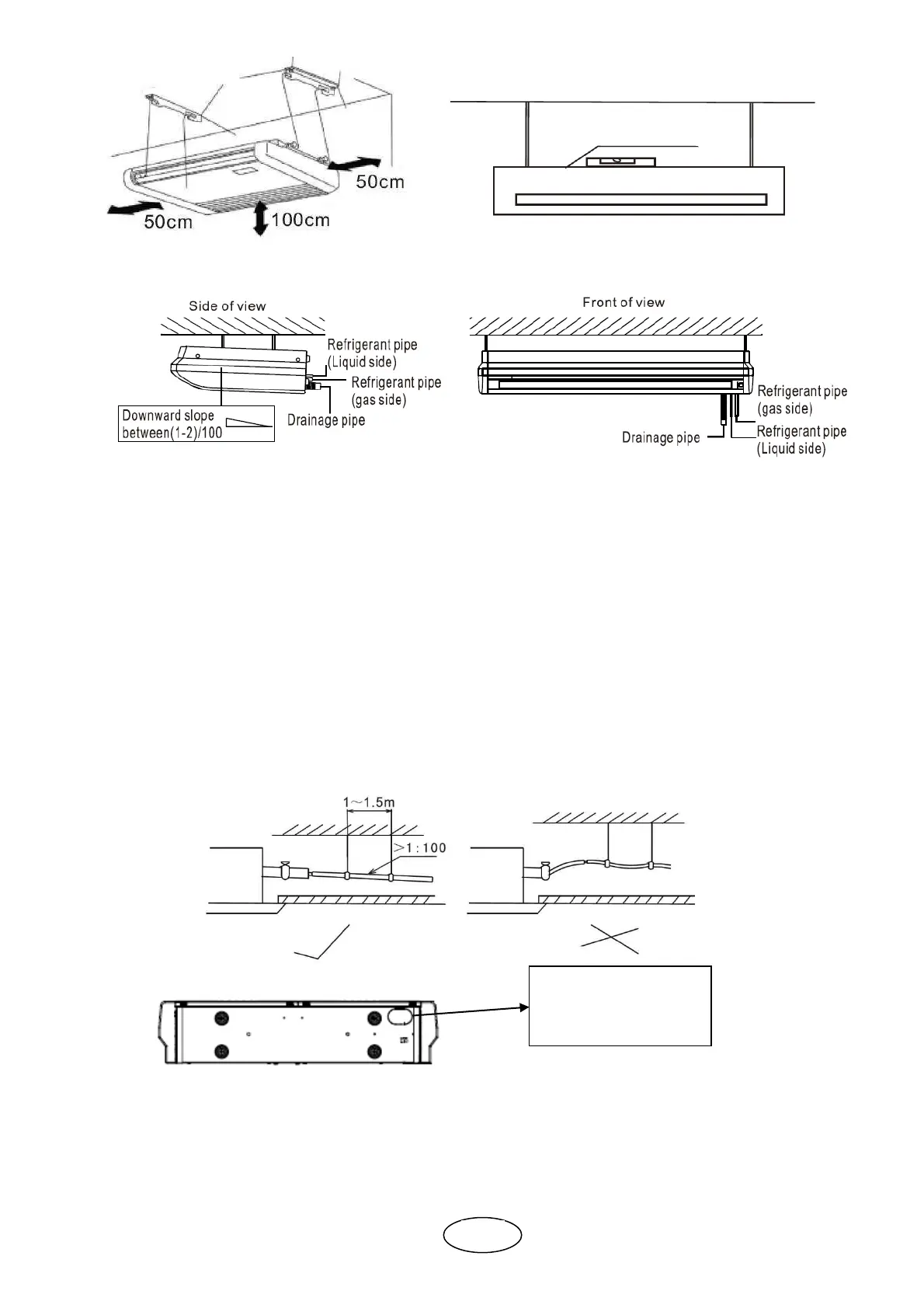 4. In order to ensure the drainage water come out successfully, the unit must be declined