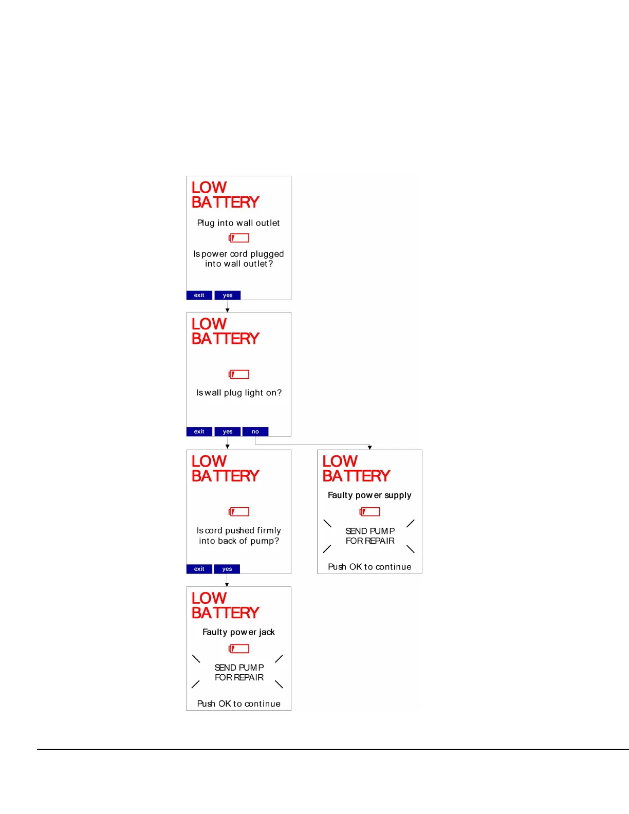 The Pump displays the following screen-by-screen instructions when the Low Battery alarm is