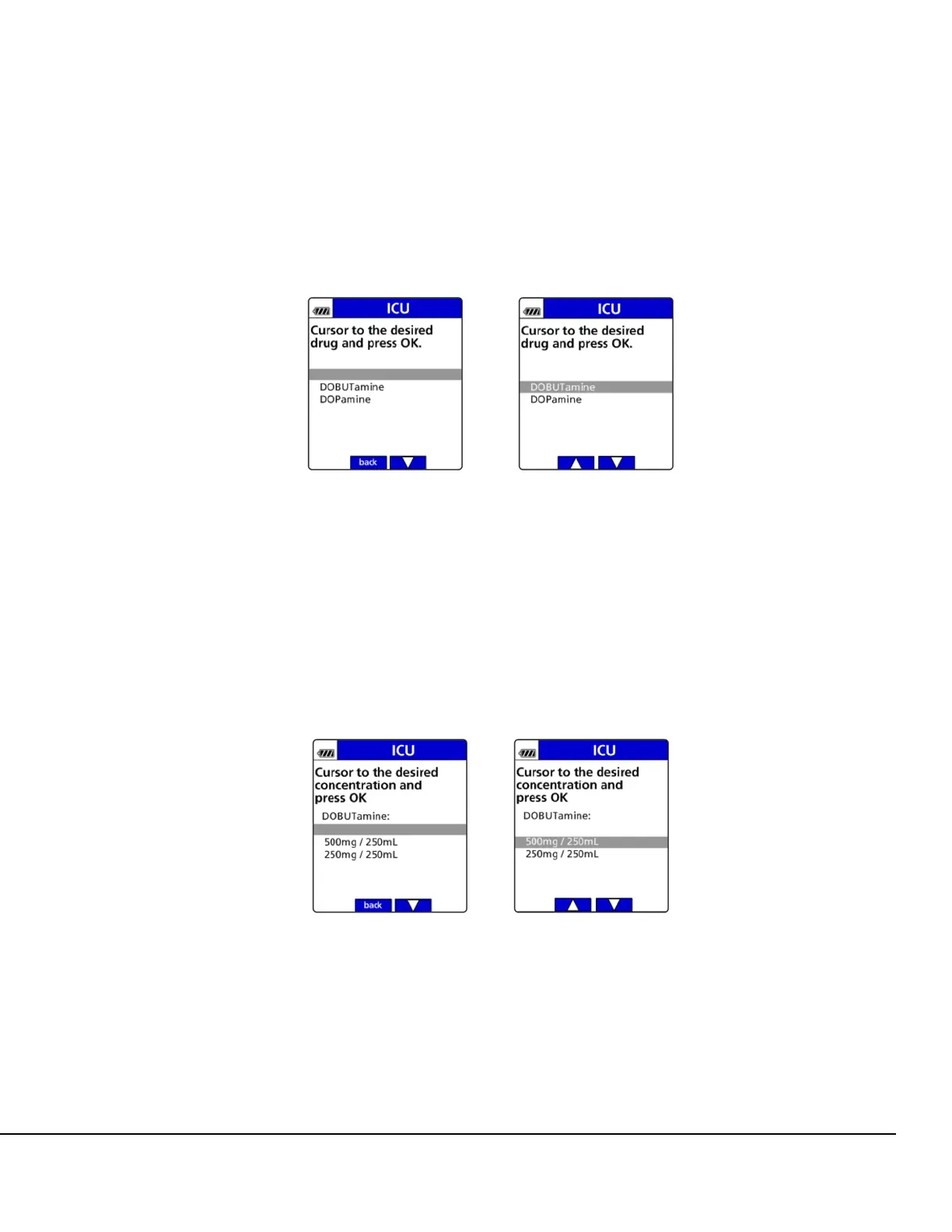 5. Press the arrow soft keys to move the cursor to the desired drug name and press OK. See