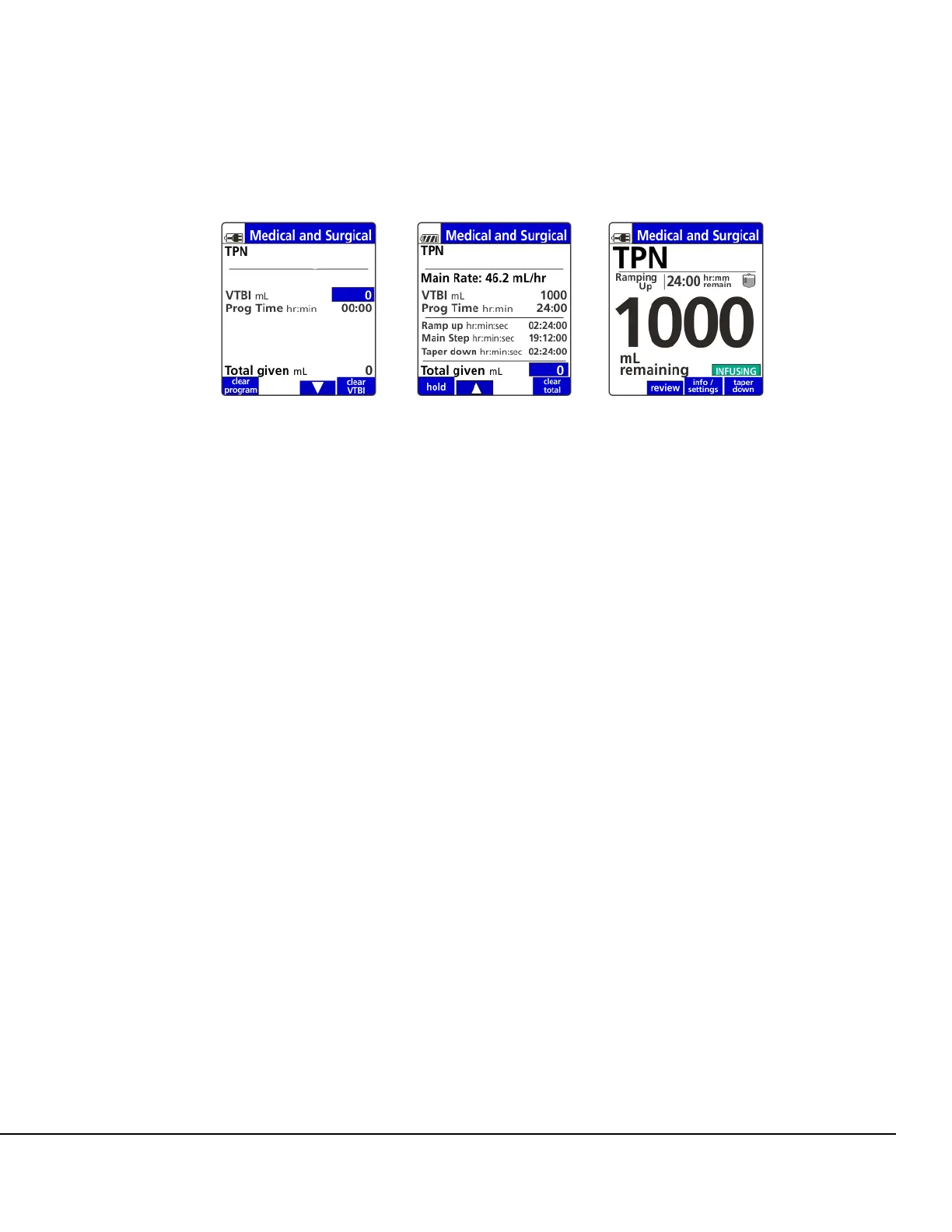 7. The screen displays with main rate, VTBI, prog time, ramp up time, main step time, taper down