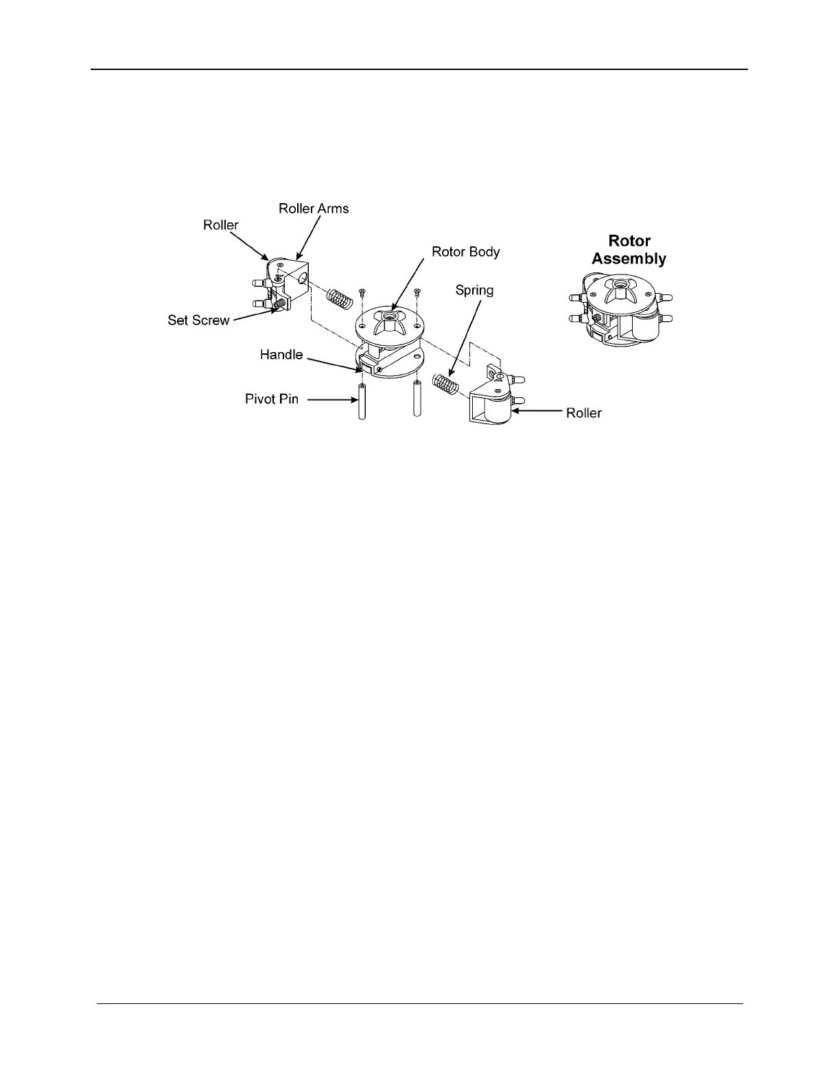 handle, rotor body, rollers, roller arms, pivot pins, set screws and