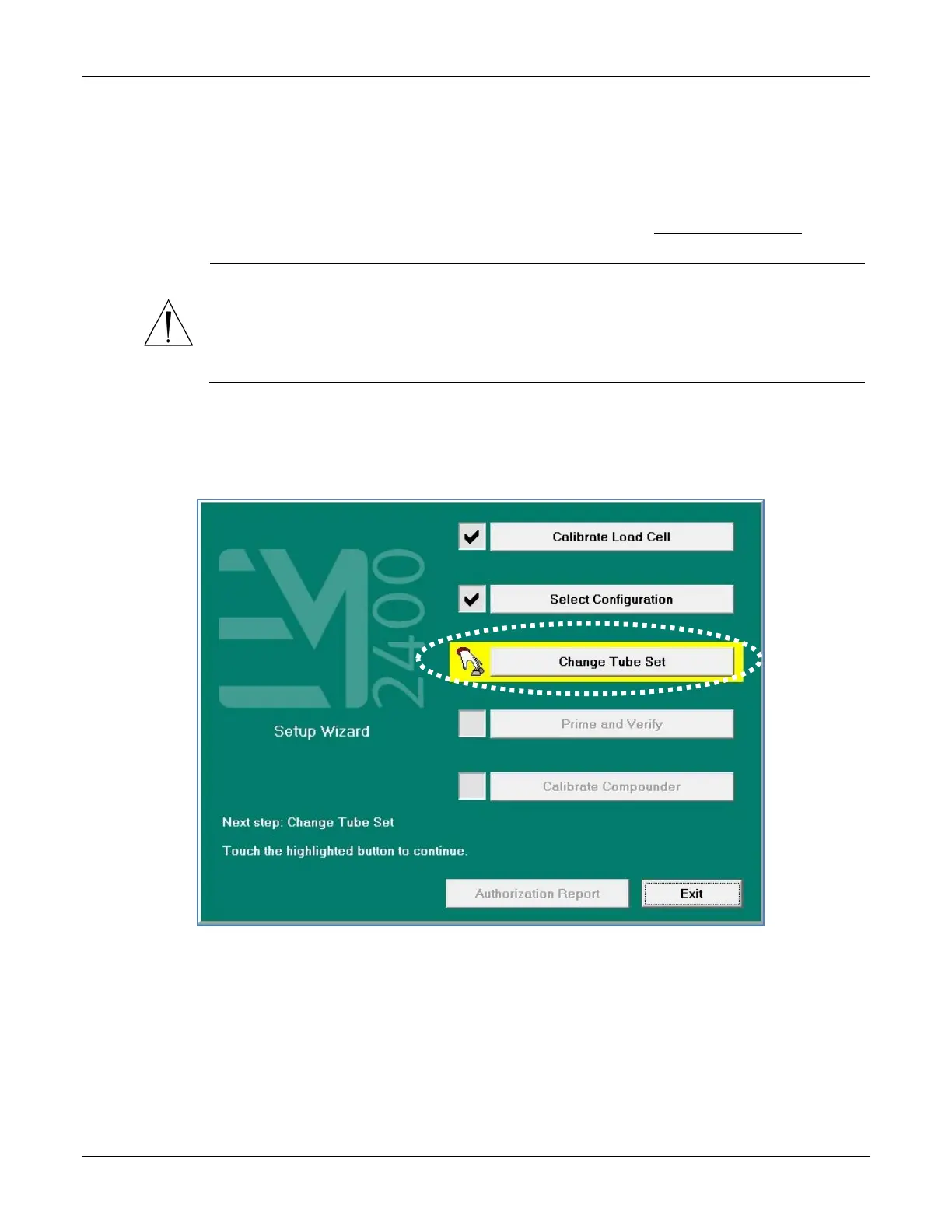 1. At the Setup Wizard screen, tap Change Tube Set.