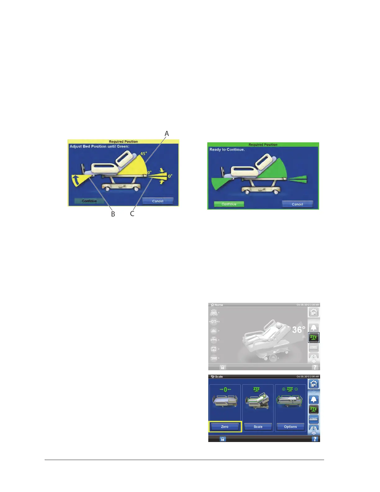 If the bed is not in the required position to zero the bed, a Required Position screen will show on the