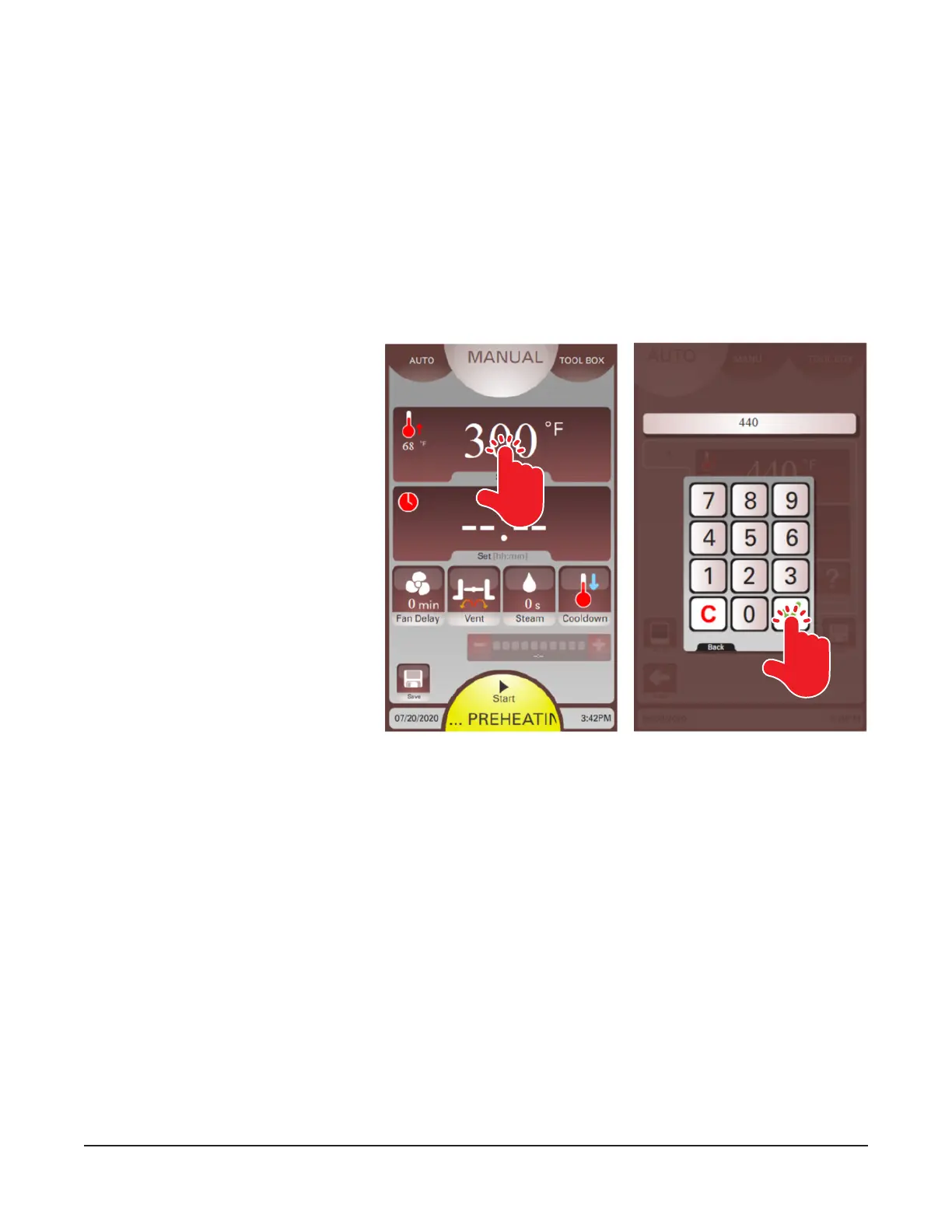 • Manual Mode - The user will have access to manually enter temperature, time, steam, fan delay