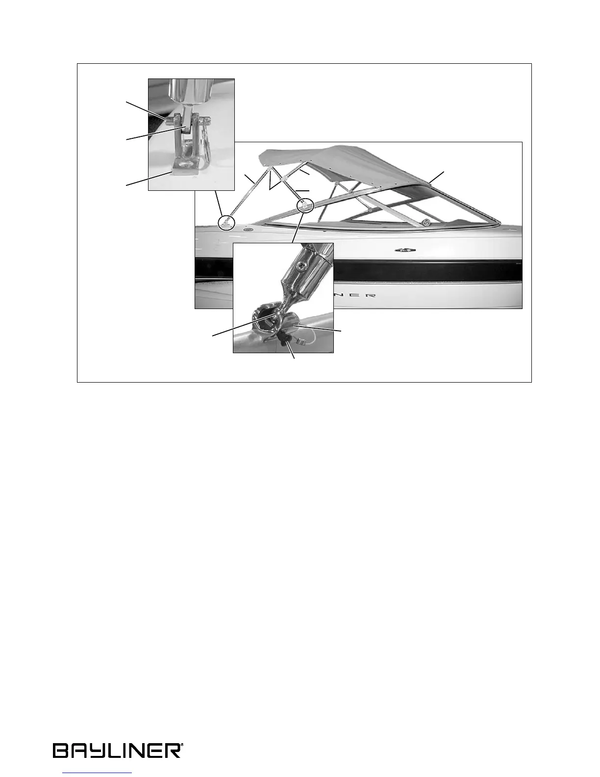 3. Insert the end eyes of the aft braces (B) into the deck hinges and secure them with the pins.