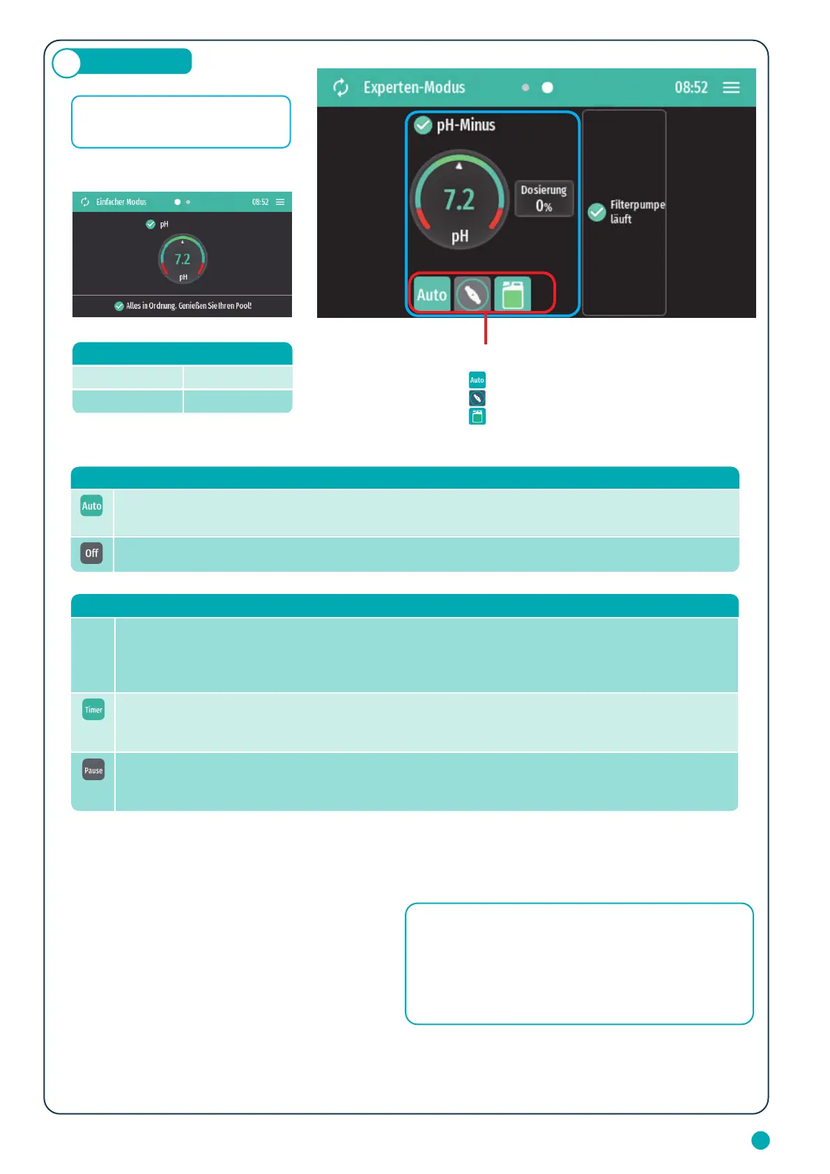 Die pH-Pumpe kann für eine einstellbare Zeit eingeschaltet werden. Sie können wählen, ob die pH-Dosierung bei