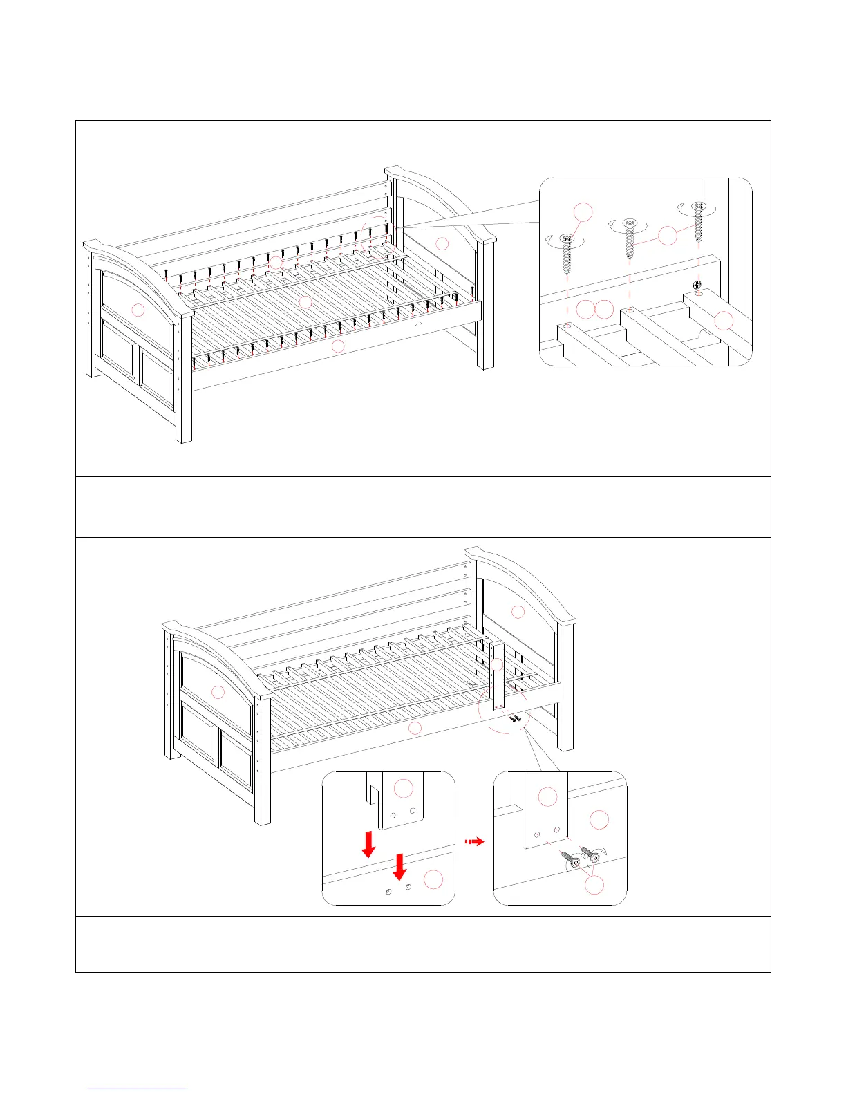 7. Lay out the upper mattress support slats (M) between the upper side rails (G and H), ensuring that every