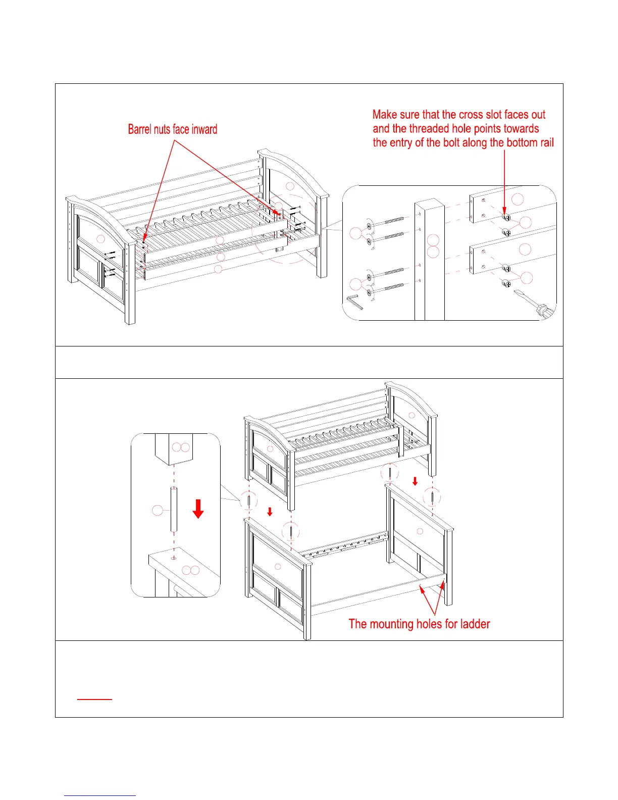 NOTE: Make sure that the upper bunk sits completely on the top of the lower bunk and the pins go all the