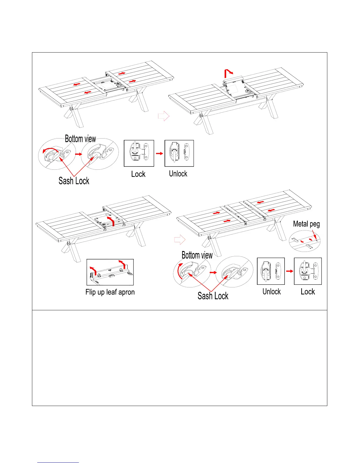 10. To add the leaf extension, unlock the sash locks underneath the table top (A) by rotating the lock handle all