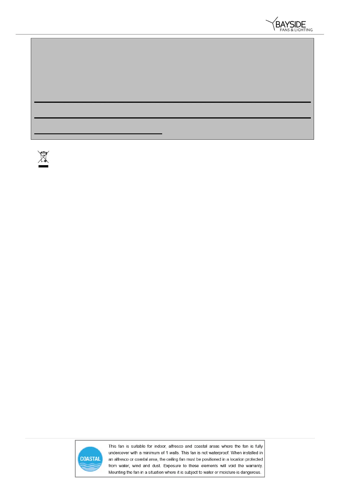minimum of 1 walls. This fan is not waterproof. When installed in an alfresco or coastal area, the