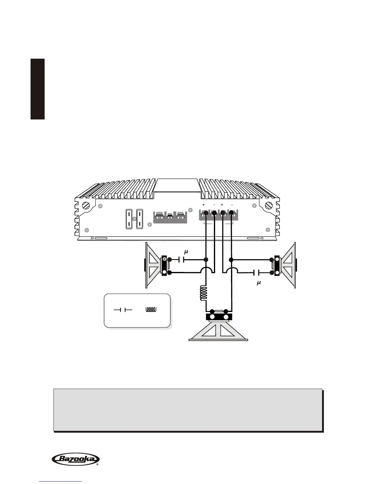 CAUTION! In Tri- mode operation, the amplifier must see a 2 Ohm load or higher for the stereo