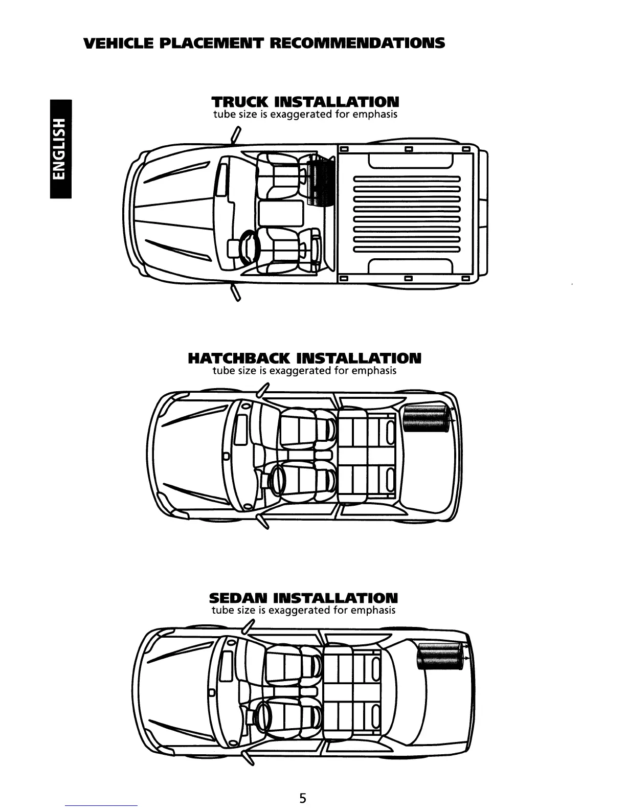 Bazooka BTA8250D - VEHICLE PLACEMENT RECOMMENDATIONS; TRUCK INSTALLATION; HATCHBACK INSTALLATION; SEDAN INSTALLATION