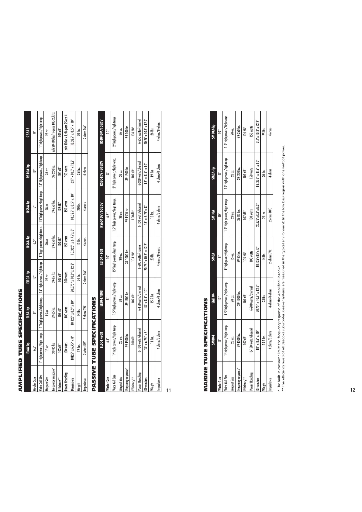 ** The efficiency levels of all Bazooka subwoofer speaker systems are measured in the typical environment: In the low bass region with one watt of power.