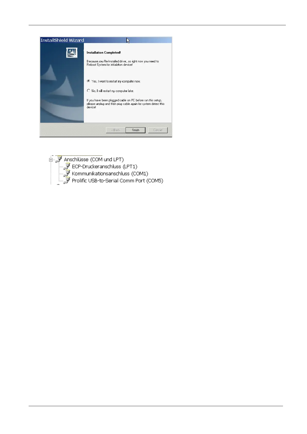 Please restart the PC. After that you will find the USB COM port in the system configuration (in this case COM5):