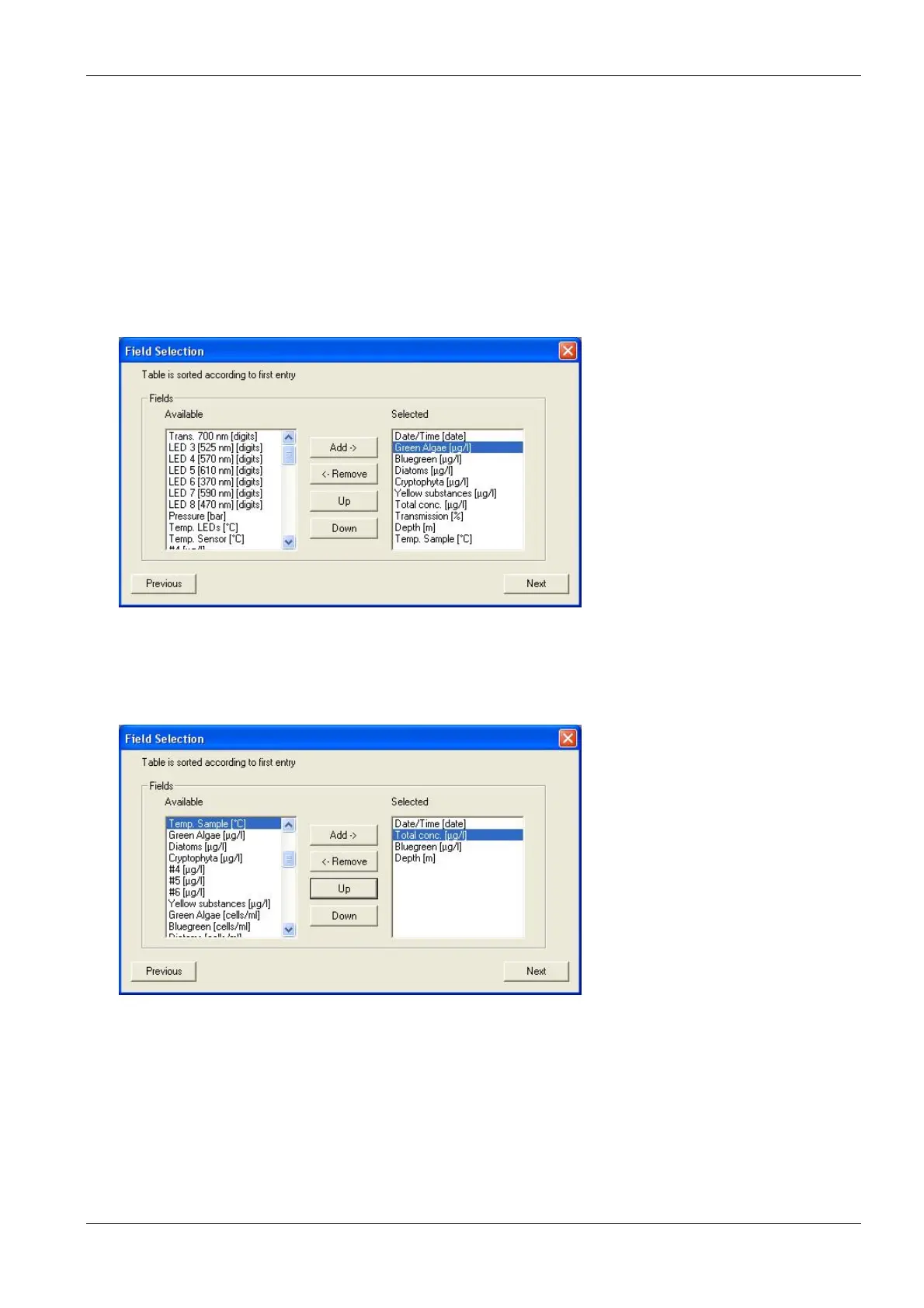 7. Repeat with all entries but “Date/Time (date)”; “Bluegreen [µg/l]”, “Total conc. [µg/l]” and “Depth [m]”.