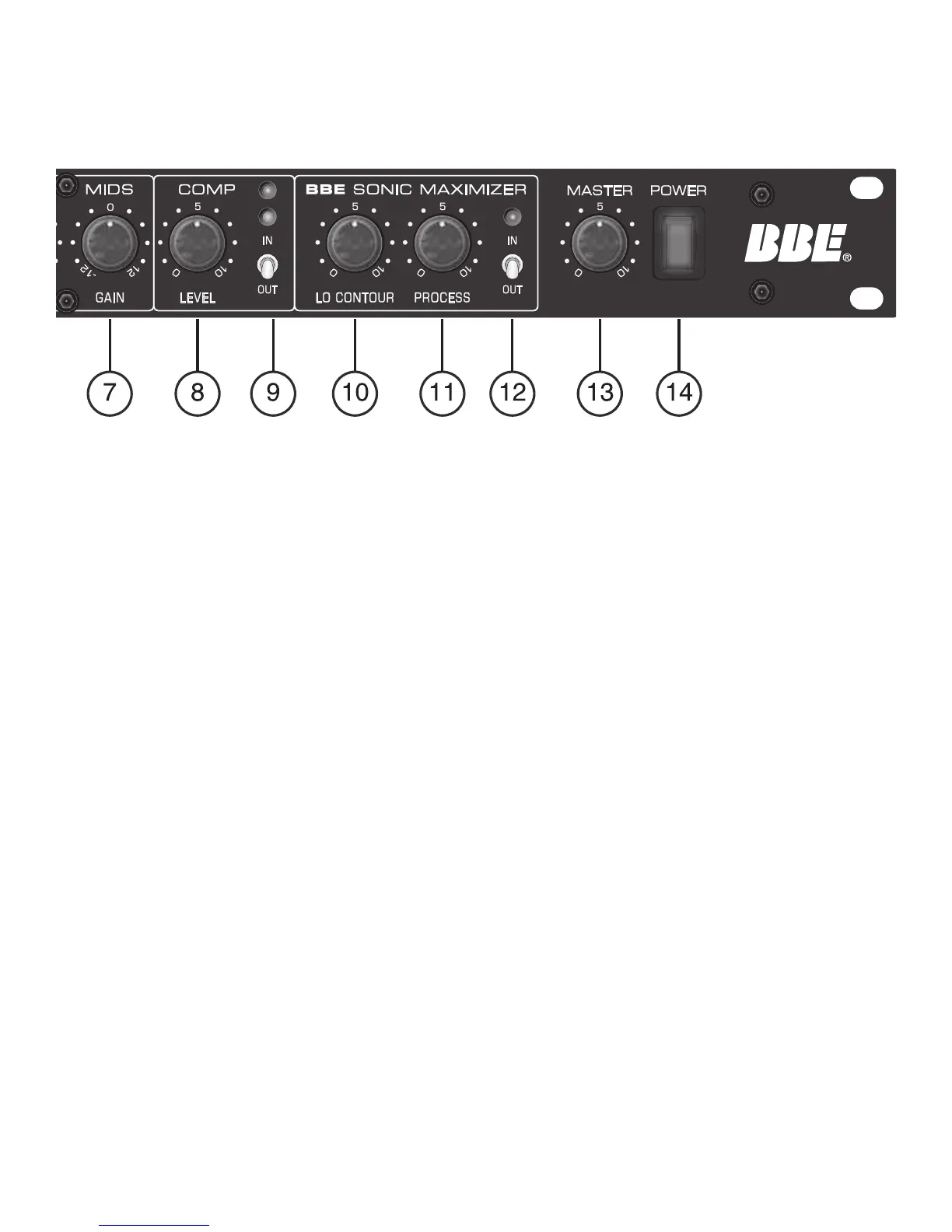 10. LO CONTOUR: This control is a low frequency adjustment for the BBE Process. It provides a boost of 10dBu