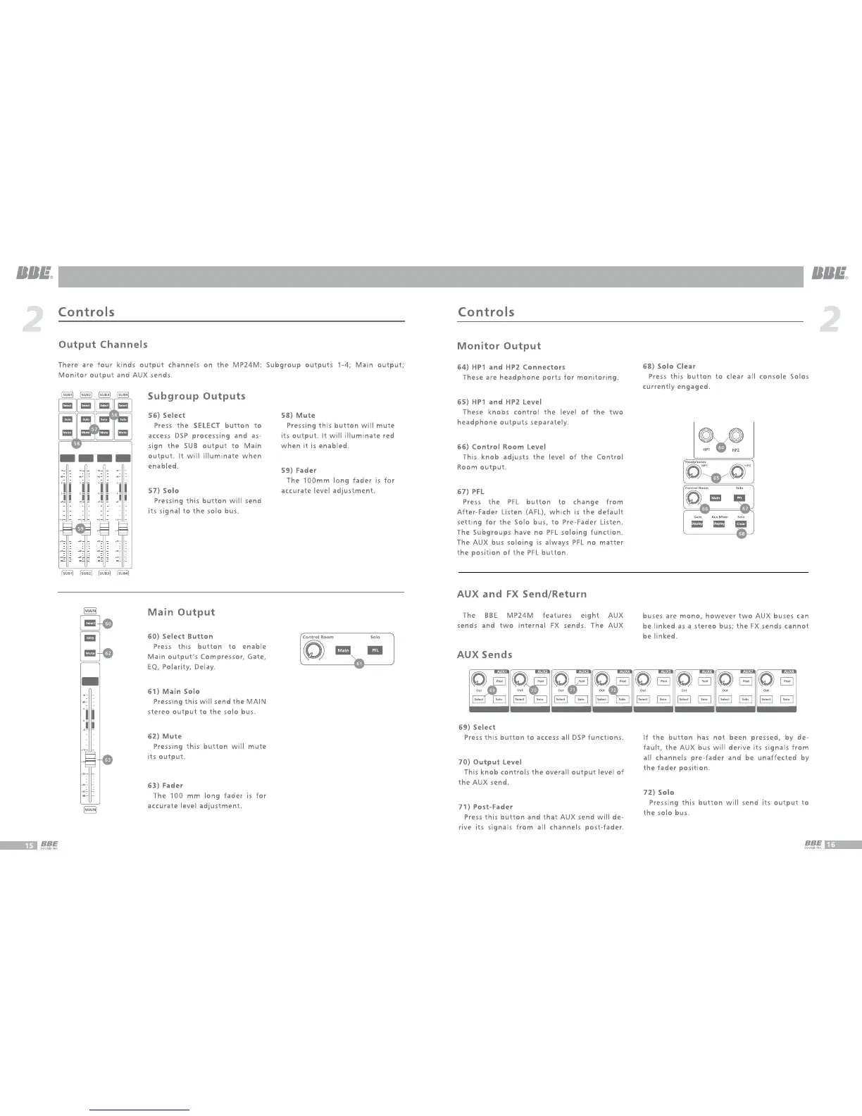 BBE MP24M - Controls: Output and Send Management; Output Channels Overview; Monitor and AUX Send Controls