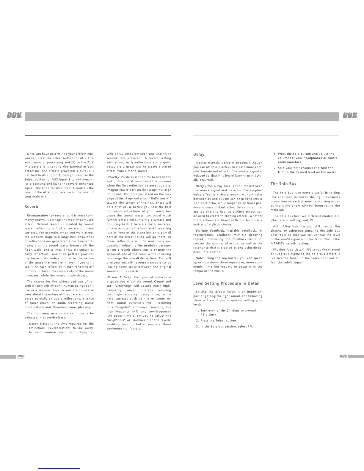 BBE MP24M - Tutorials: Reverb, Delay, and Solo Bus; Reverb Effect Parameters; Delay Effect Parameters; Level Setting and Solo Bus