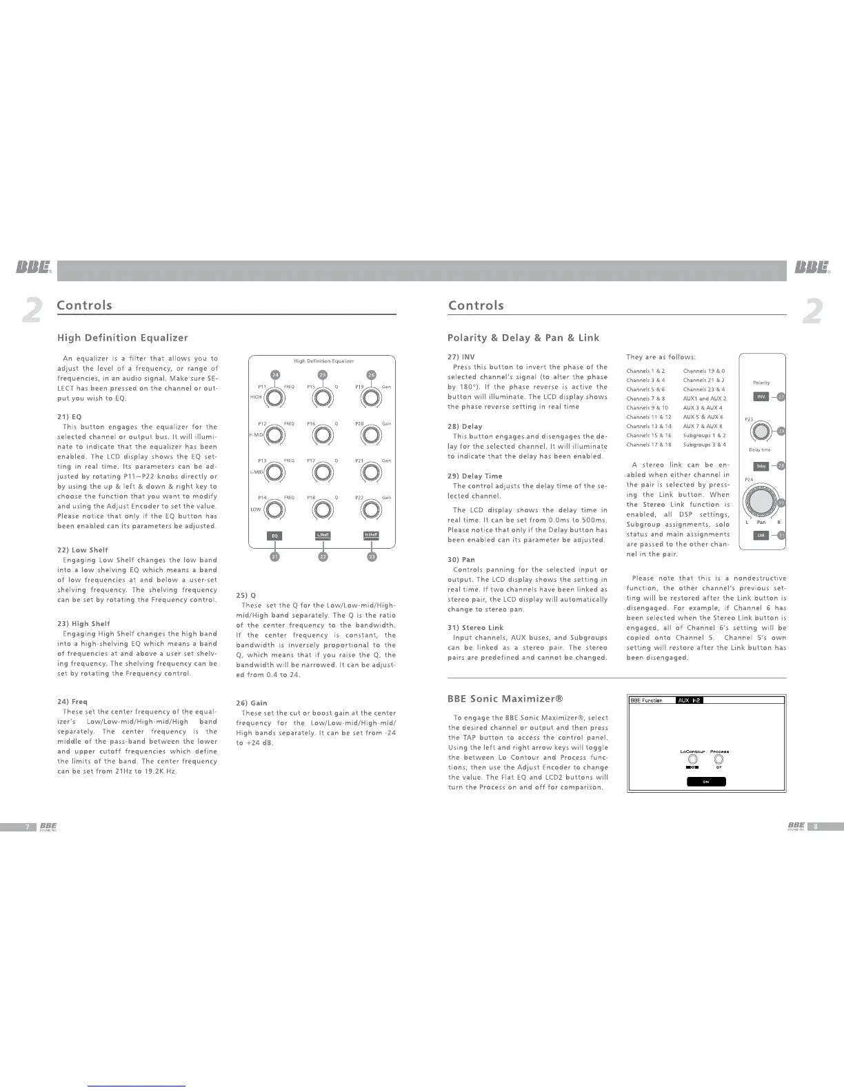 BBE MP24M - Controls: EQ and Signal Shaping; High Definition Equalizer; Polarity, Delay, Pan, Link; BBE Sonic Maximizer