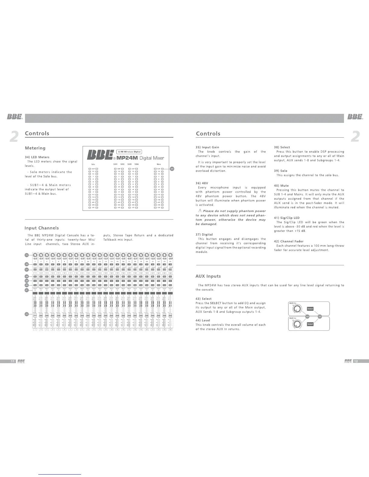 BBE MP24M - Controls: Channel and Input Features; Metering and Input Channels; AUX Inputs
