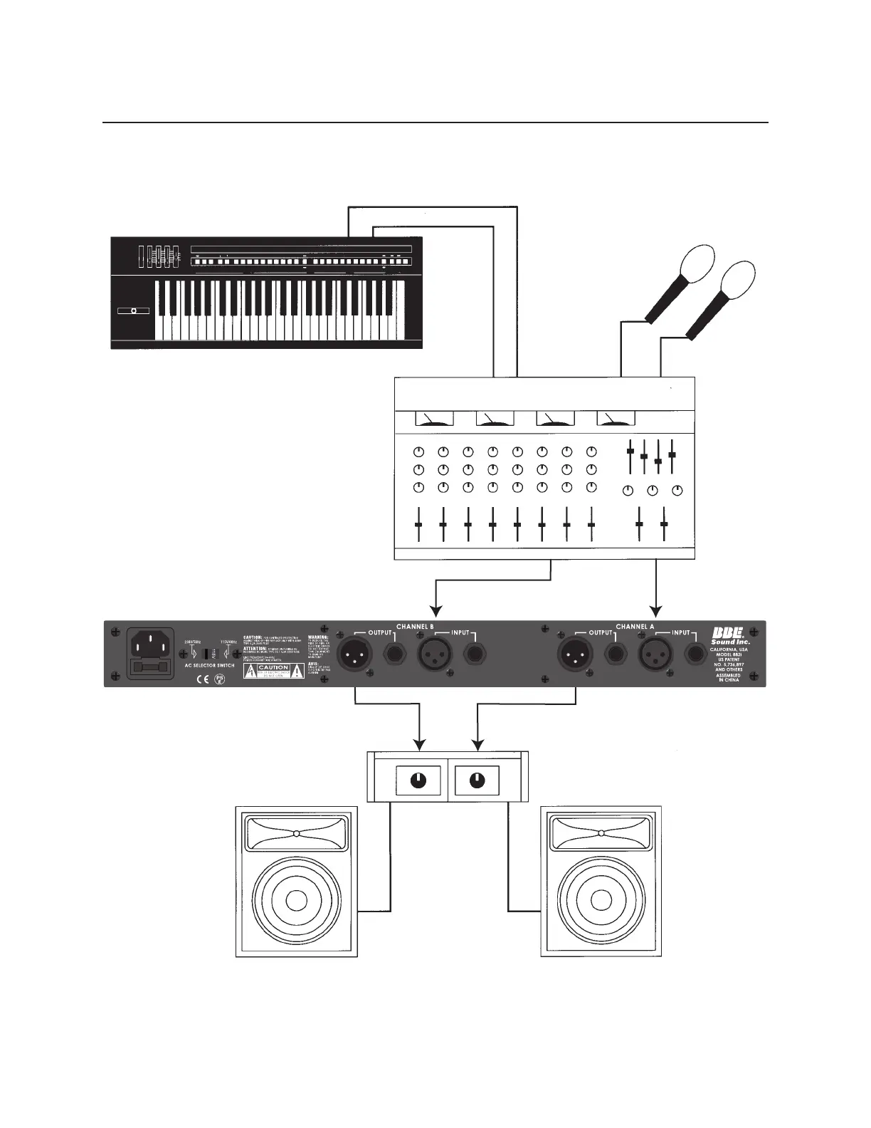 Connect the BBE 882i to the output of the mixing console. The output of the BBE will drive either