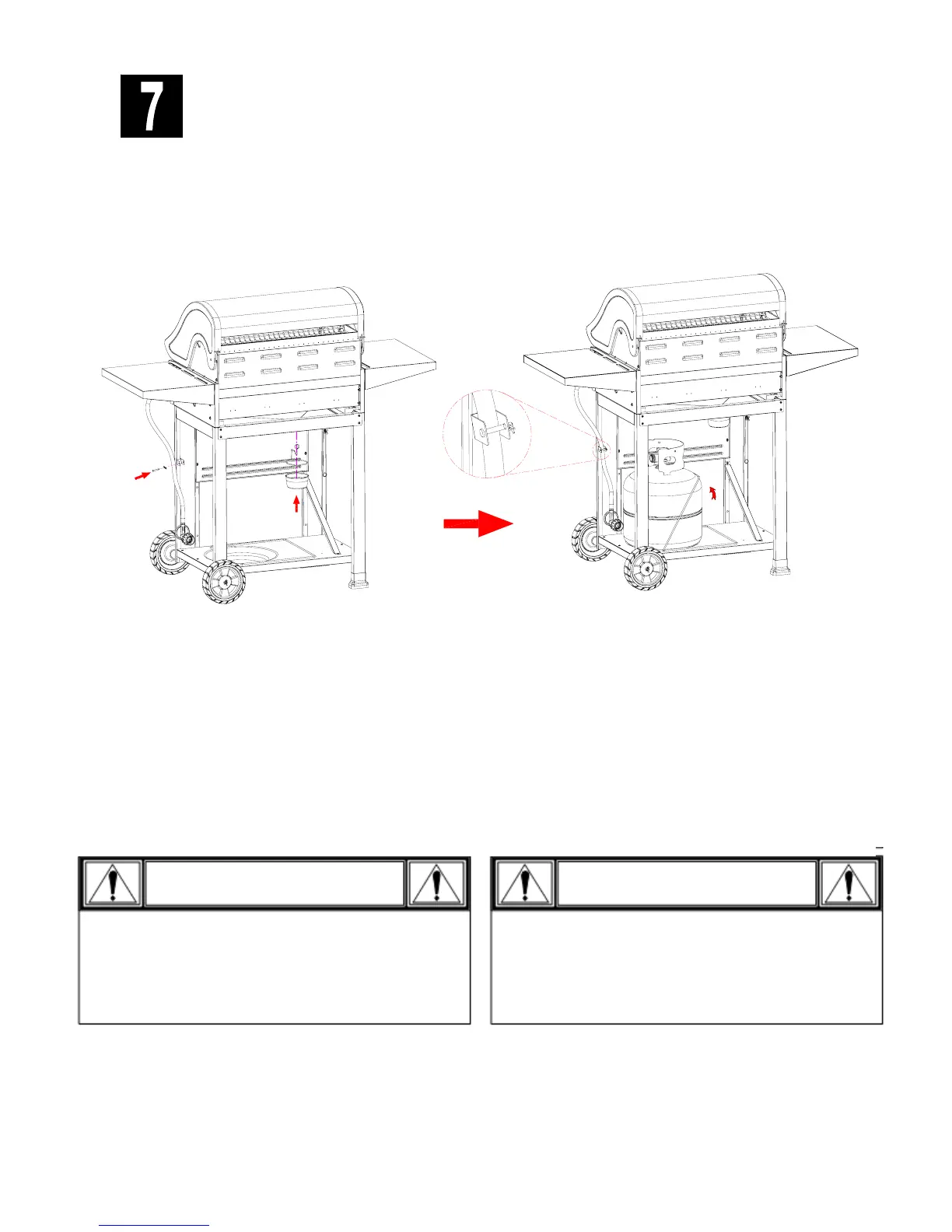 □ Place LP tank into hole in bottom shelf with tank collar opening facing to side as shown. Rise tank holder to