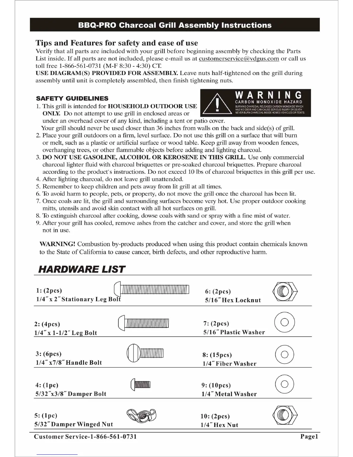 BBQ BBQ-PRO - Charcoal Grill Assembly Guide; Safety Guidelines and Usage Tips; Hardware Identification