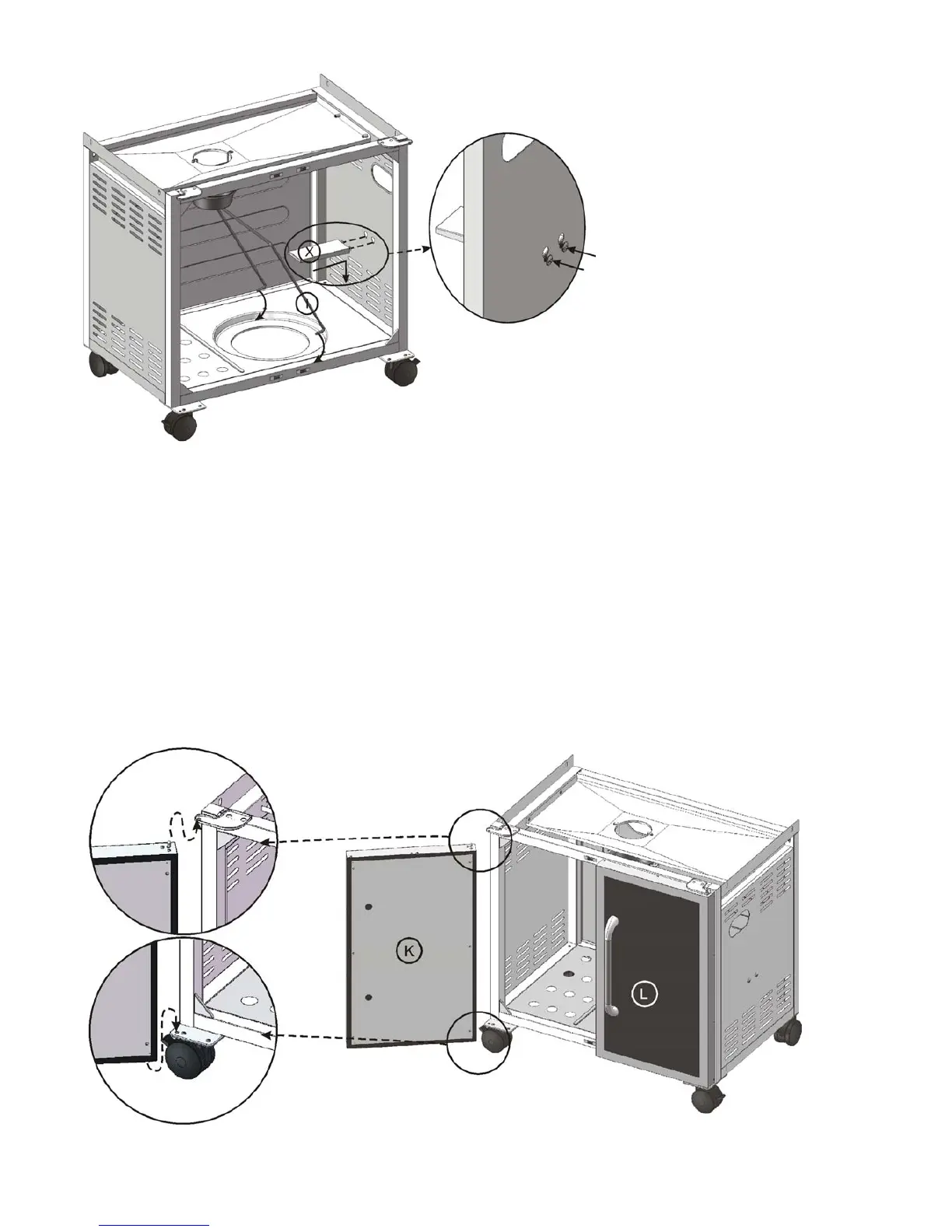 a) Insert the bottom pin of left door (K) into the pre-drilled hole on the cart bottom panel.
