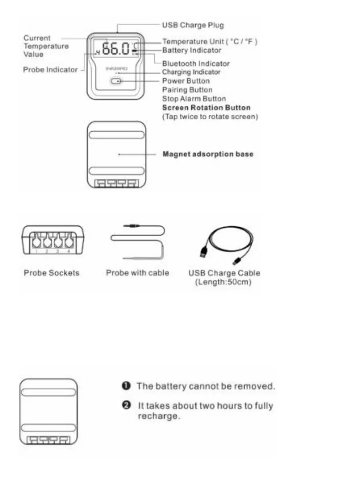 This device provides 4 probe sockets, which enable you to monitor up to 4 food at same time.