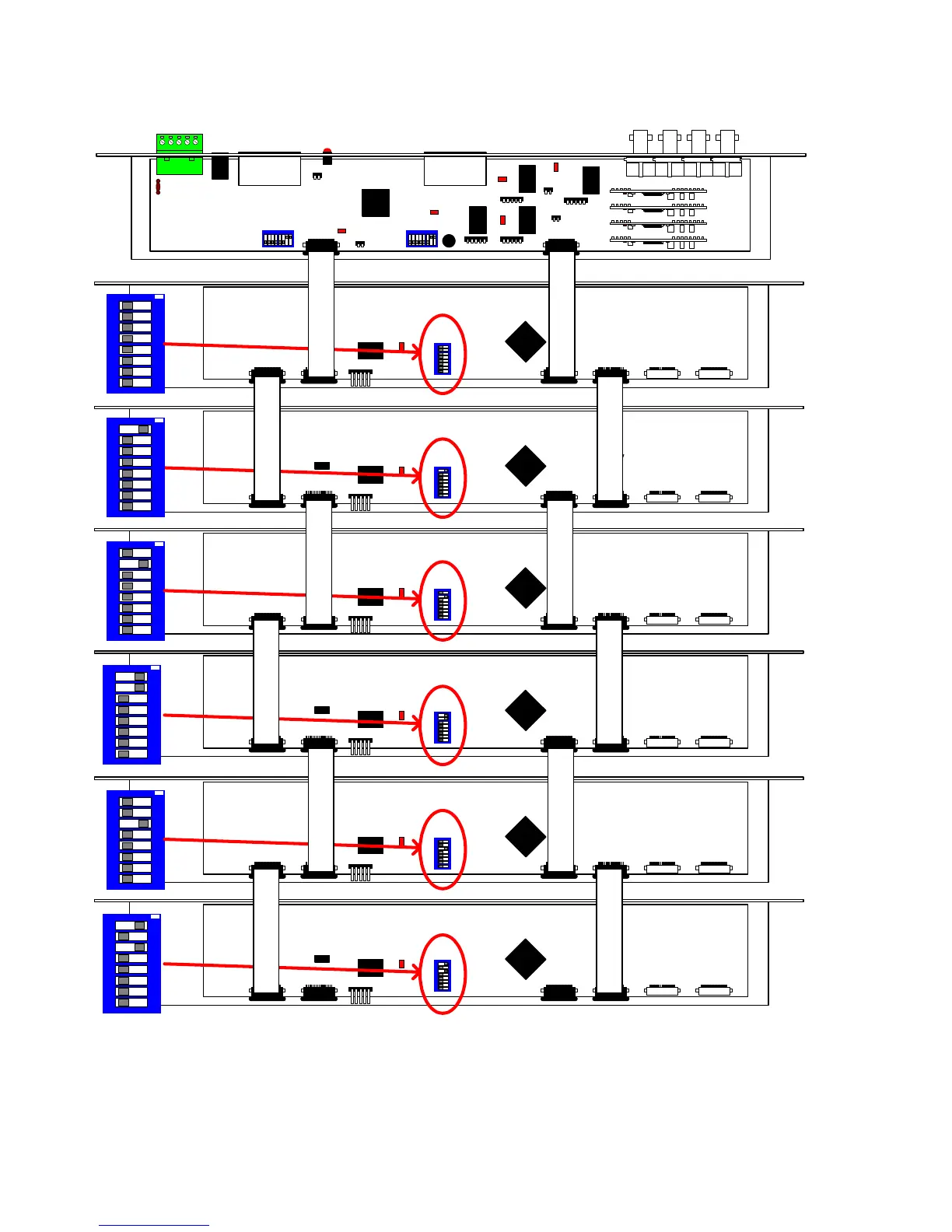 Wiring and switch settings for Video Input cards and Monitor Output card.