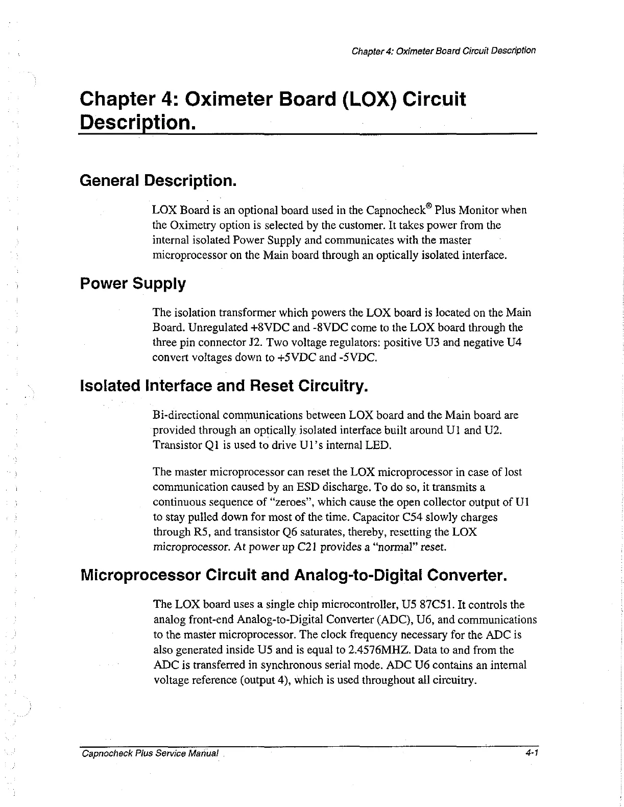 BCI Capnocheck Plus - Oximeter Board (LOX) Circuitry; LOX Board Overview and Power; Interface and Reset Circuitry; Microprocessor and ADC Circuitry