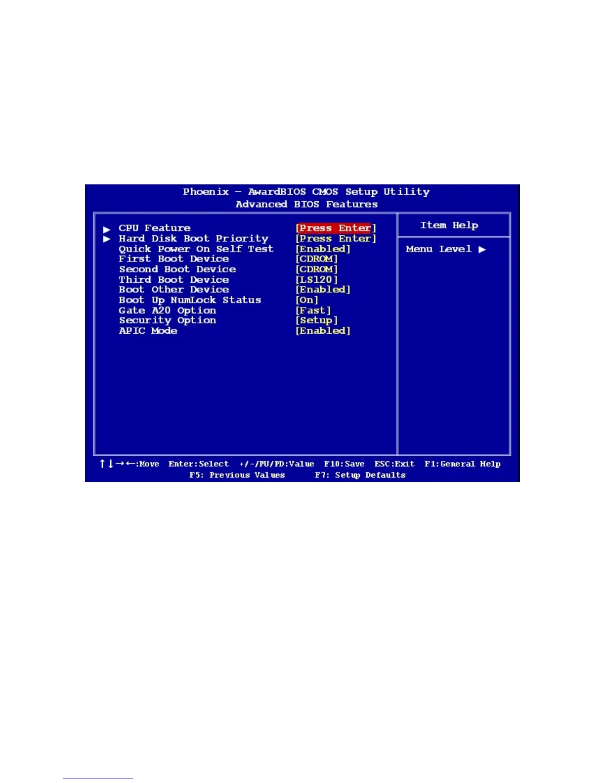 The “Advanced BIOS Features” screen appears when choosing the “Advanced BIOS