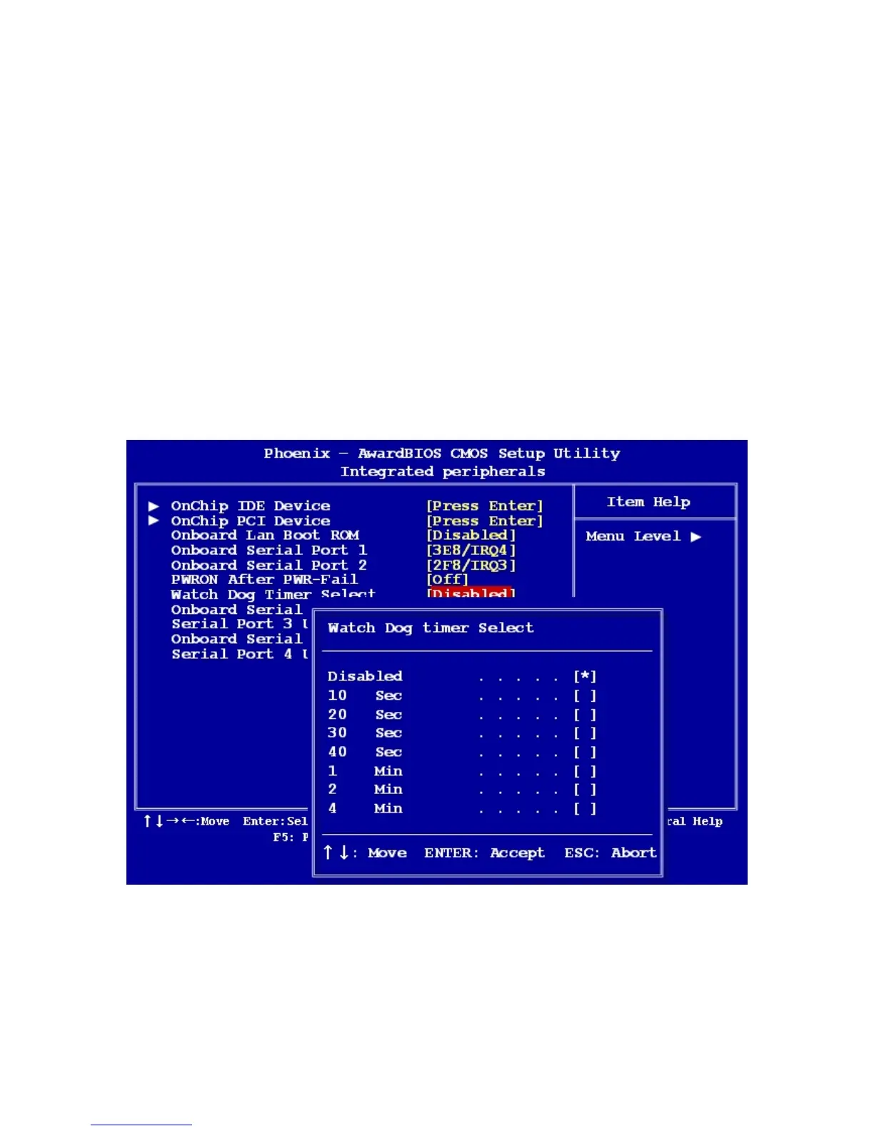 This option will determine watch dog timer. The choices: Disabled, 10, 20, 30, 40 Sec. 1, 2,