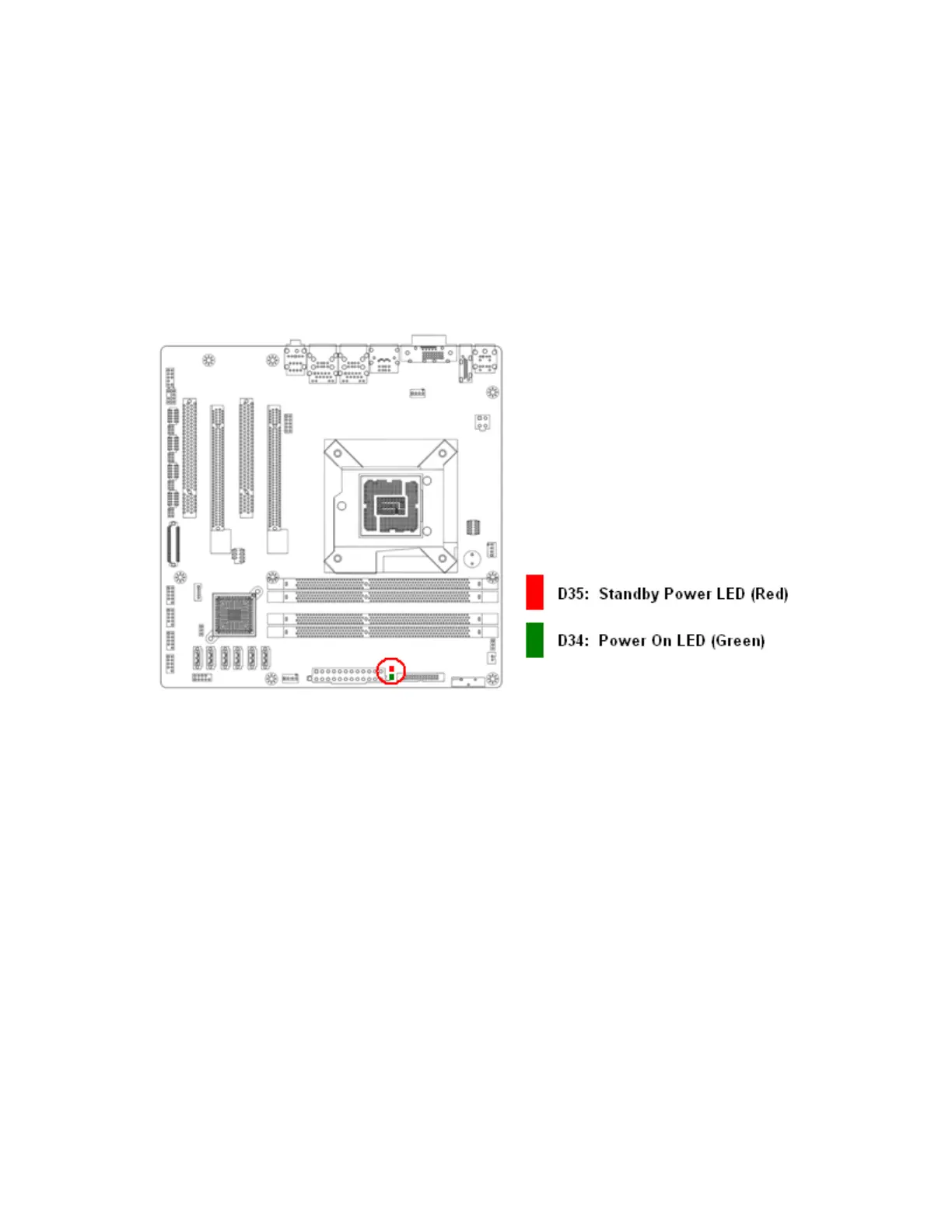 The mainboard comes with a “Power On LED” (green) and one “Standby Power LED” (red) to indicate the