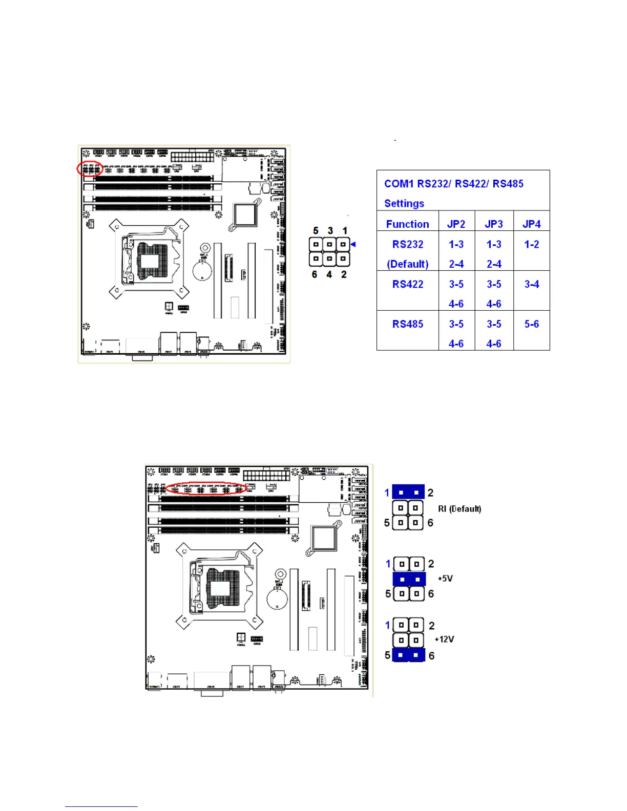 These jumpers provide combinations for RS232 (default), or RS422, or RS485 transfer mode on COM1