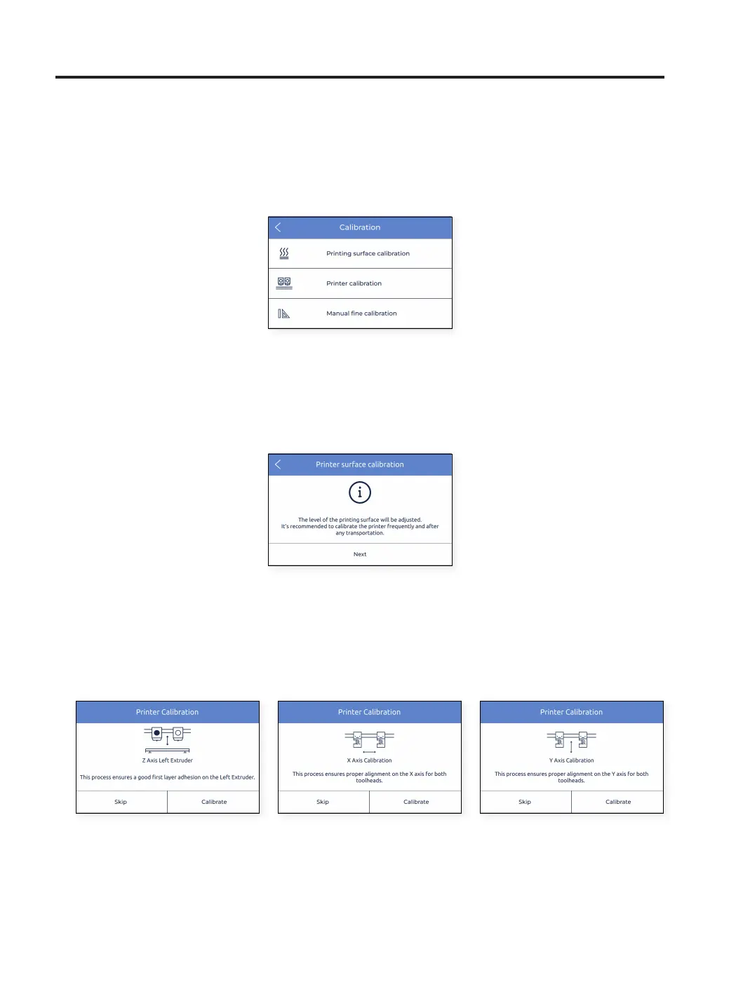 Several options are available with regards to the calibration of the printer.
